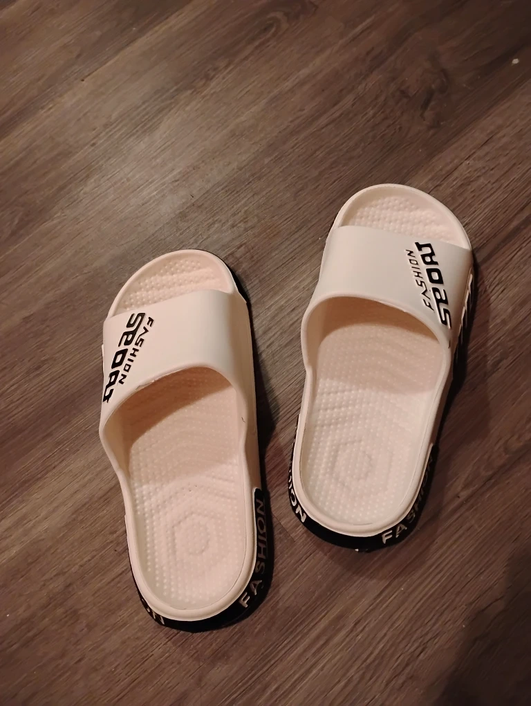 These are some Fashion Sport slides in white. They're perfect for wearing around the house or out to the beach. They are in good condition and ready for a new owner
