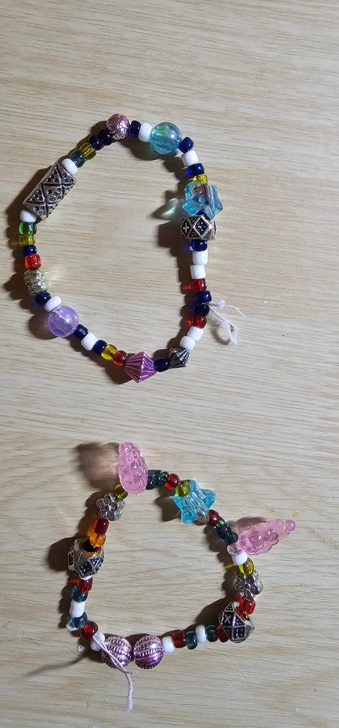 Selling a set of two handmade beaded bracelets. They feature a colourful mix of beads and charms. Perfect for adding a unique touch to any outfit!