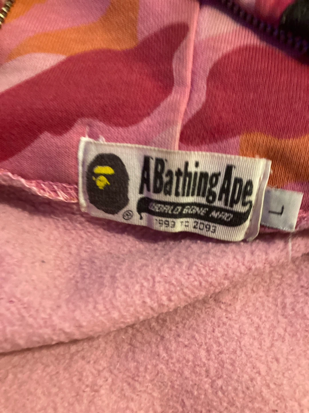 Selling a pink camo shark hoodie from A Bathing Ape (BAPE) in size large. It's a really eye-catching piece with the iconic shark design on the hood. Perfect for adding a pop of colour to your wardrobe!