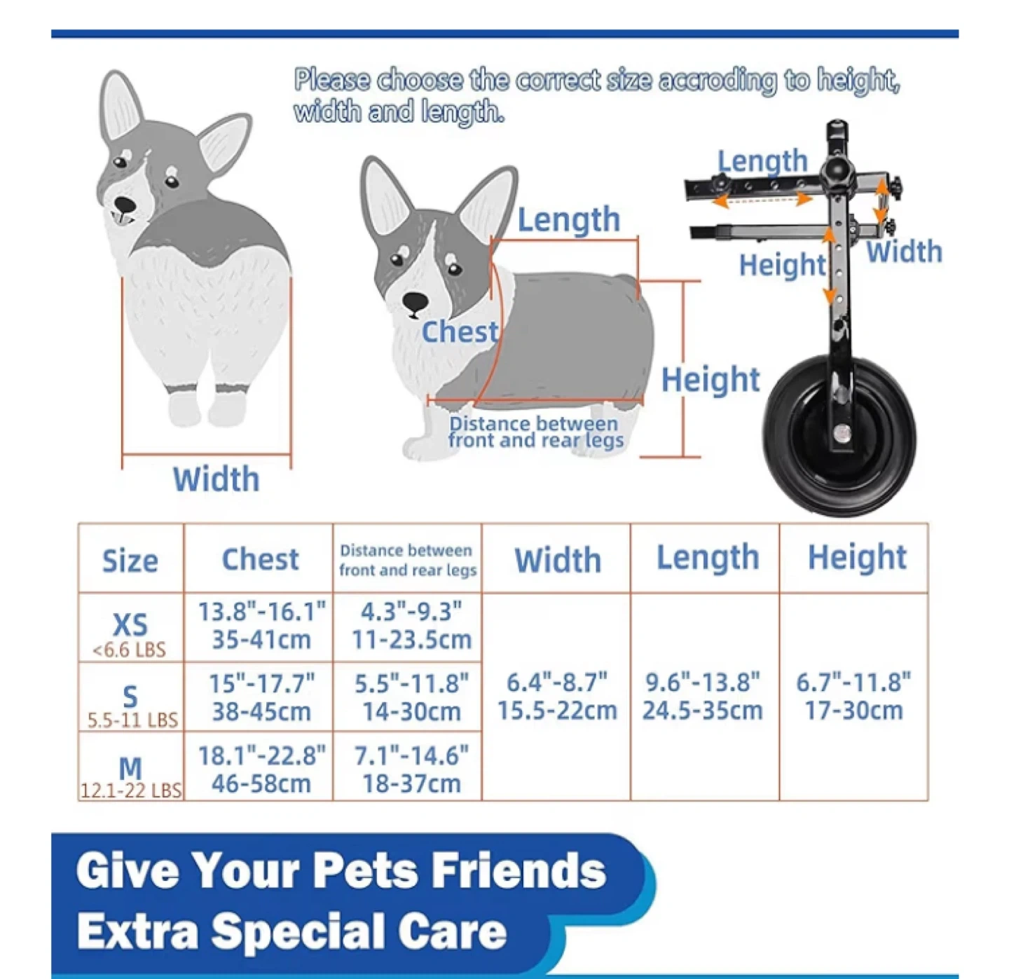 Adjustable Pets Cart with Wheels, Dog Wheel Chair for Small Pets