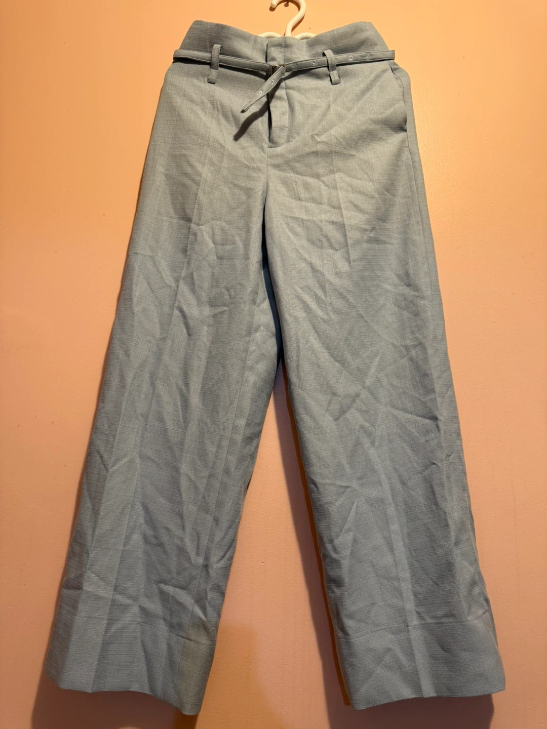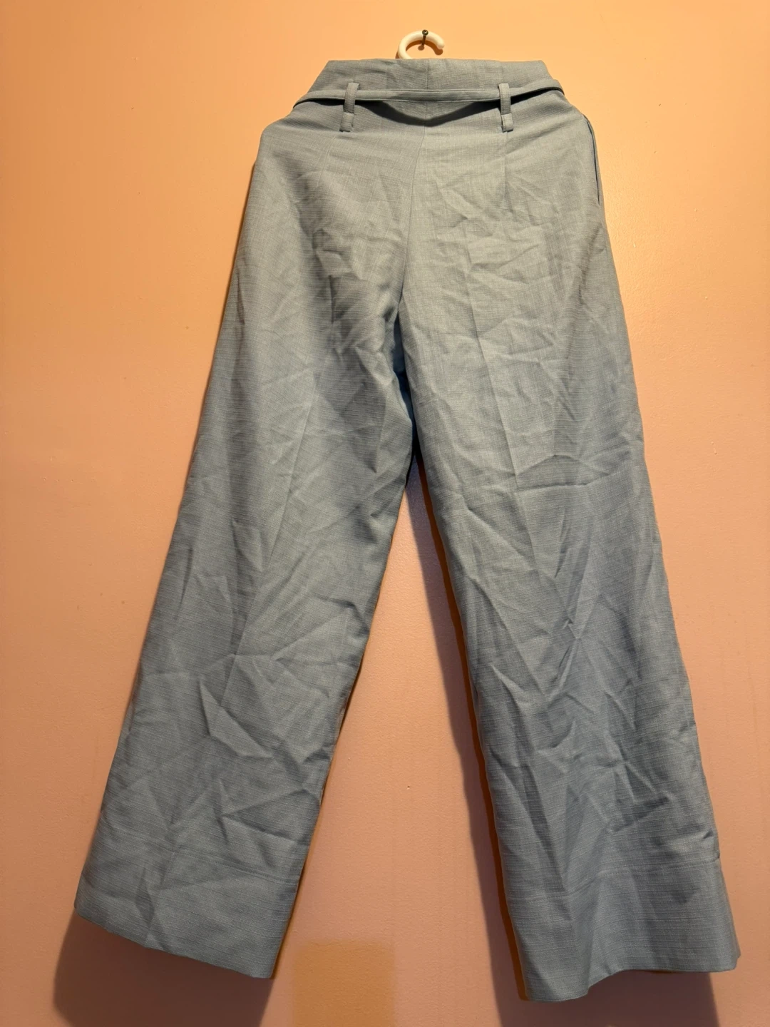 Selling a pair of light blue wide leg trousers. They have a tie at the waist and are in great condition!