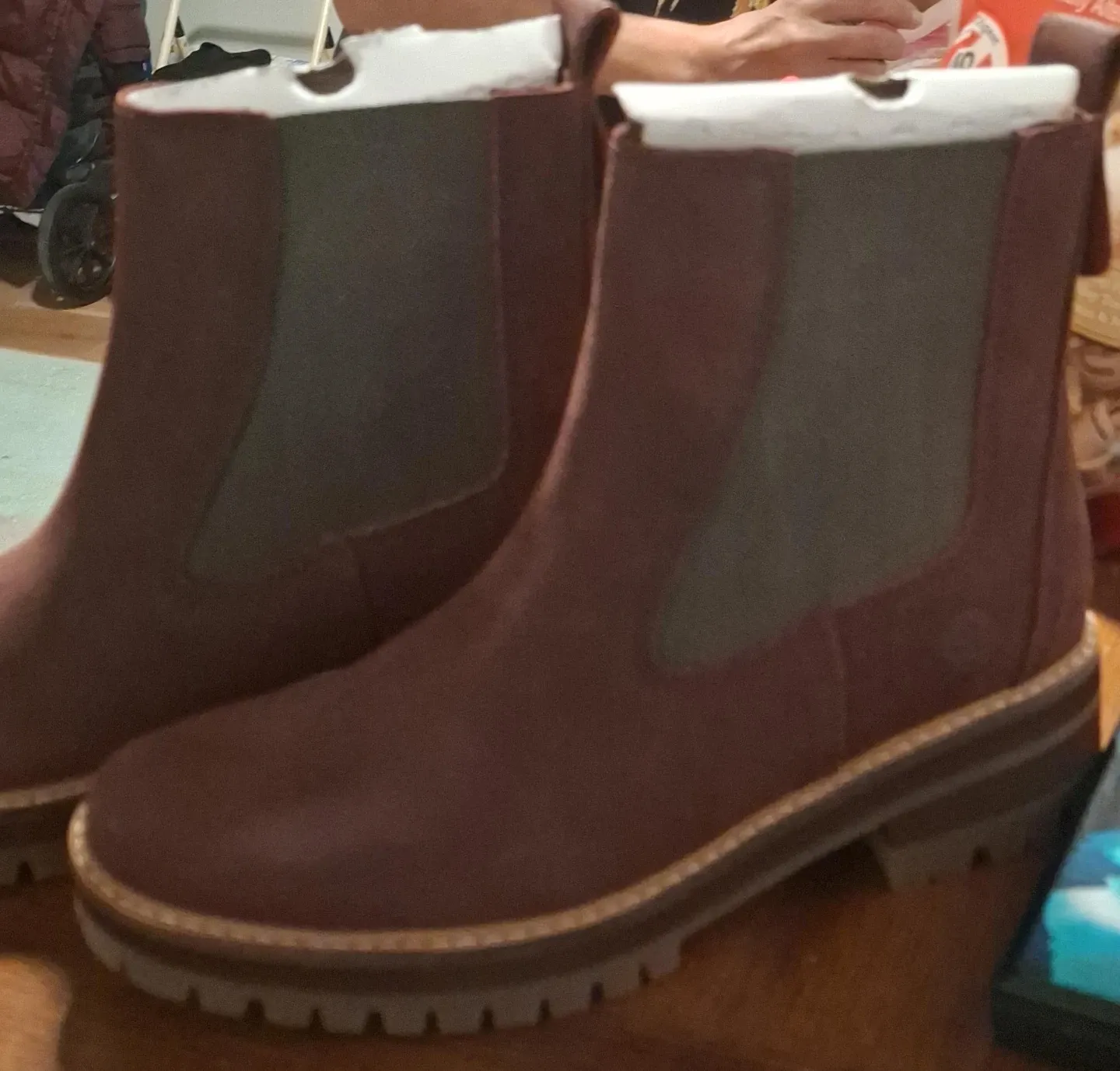 Selling a pair of Timberland Chelsea boots in a beautiful burgundy suede! These boots are perfect for adding a touch of style to any outfit. They feature a comfortable sole and classic Chelsea boot design.
