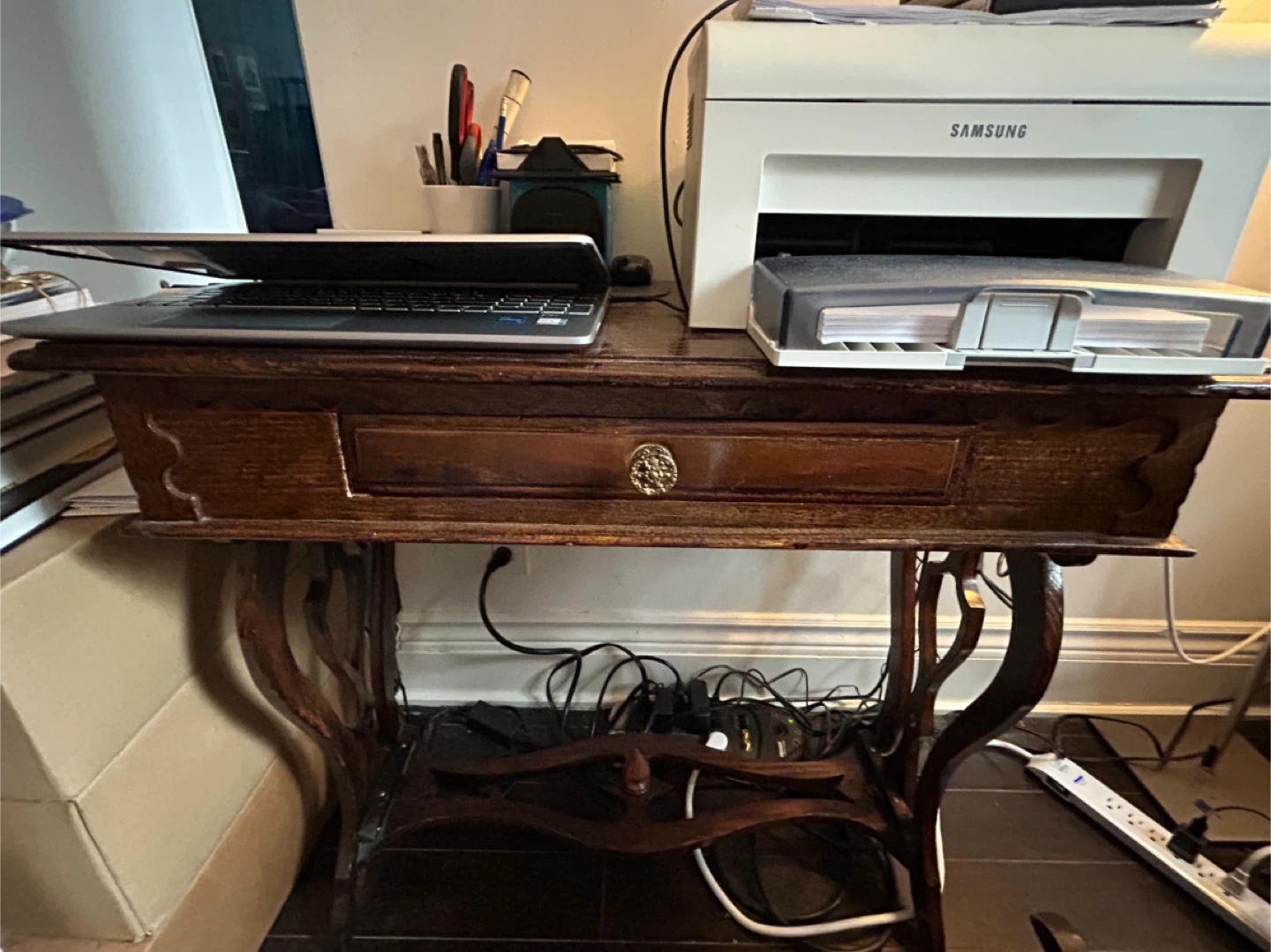 Selling a lovely antique-style wooden desk. It features a drawer with a decorative knob and unique curved legs. Perfect for adding a touch of vintage charm to your space!