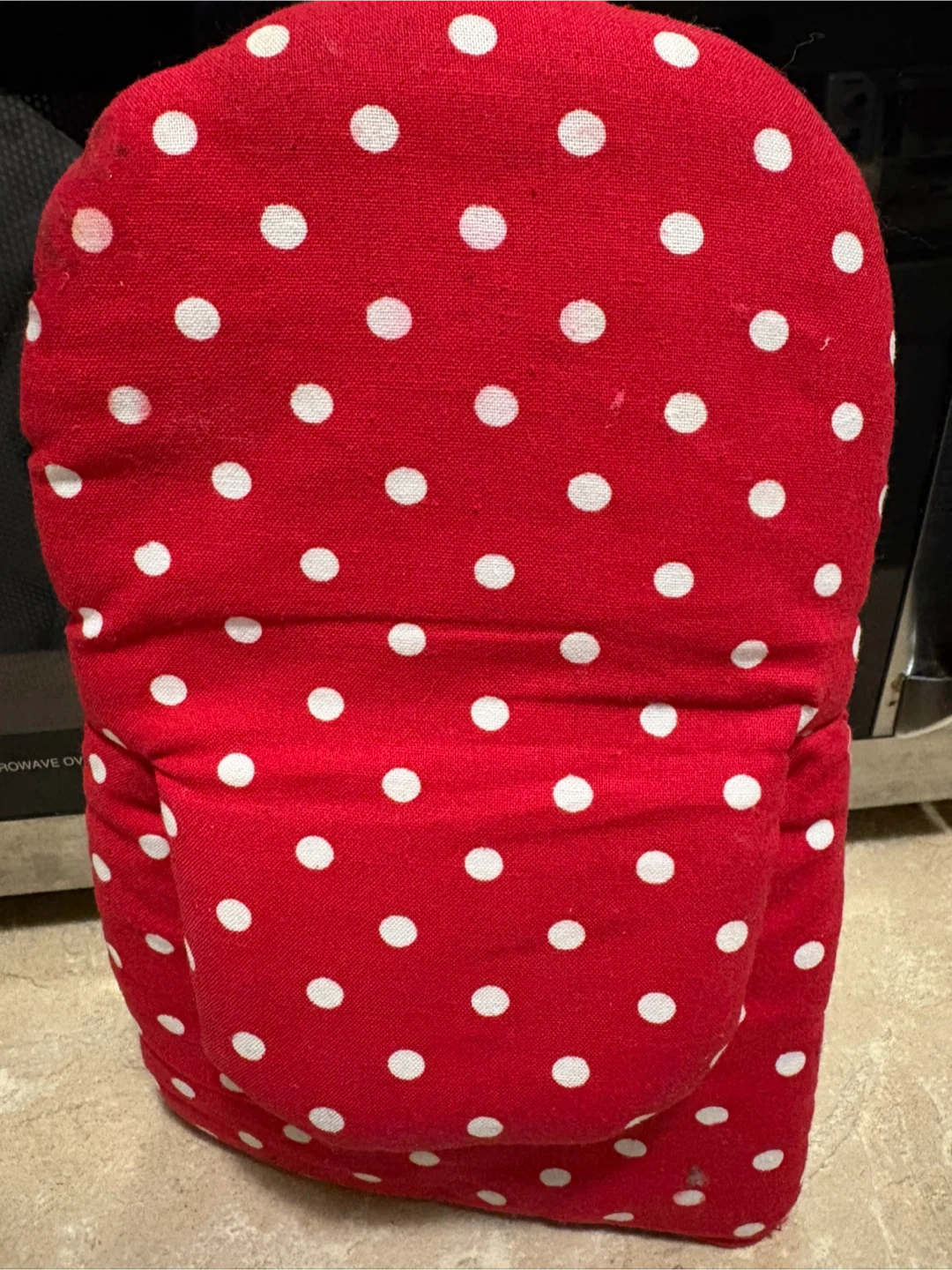 This is a cute snowman oven mitt! It has a red and white polka dot background, a blue hat, and a white snowman with a green striped scarf and orange nose
