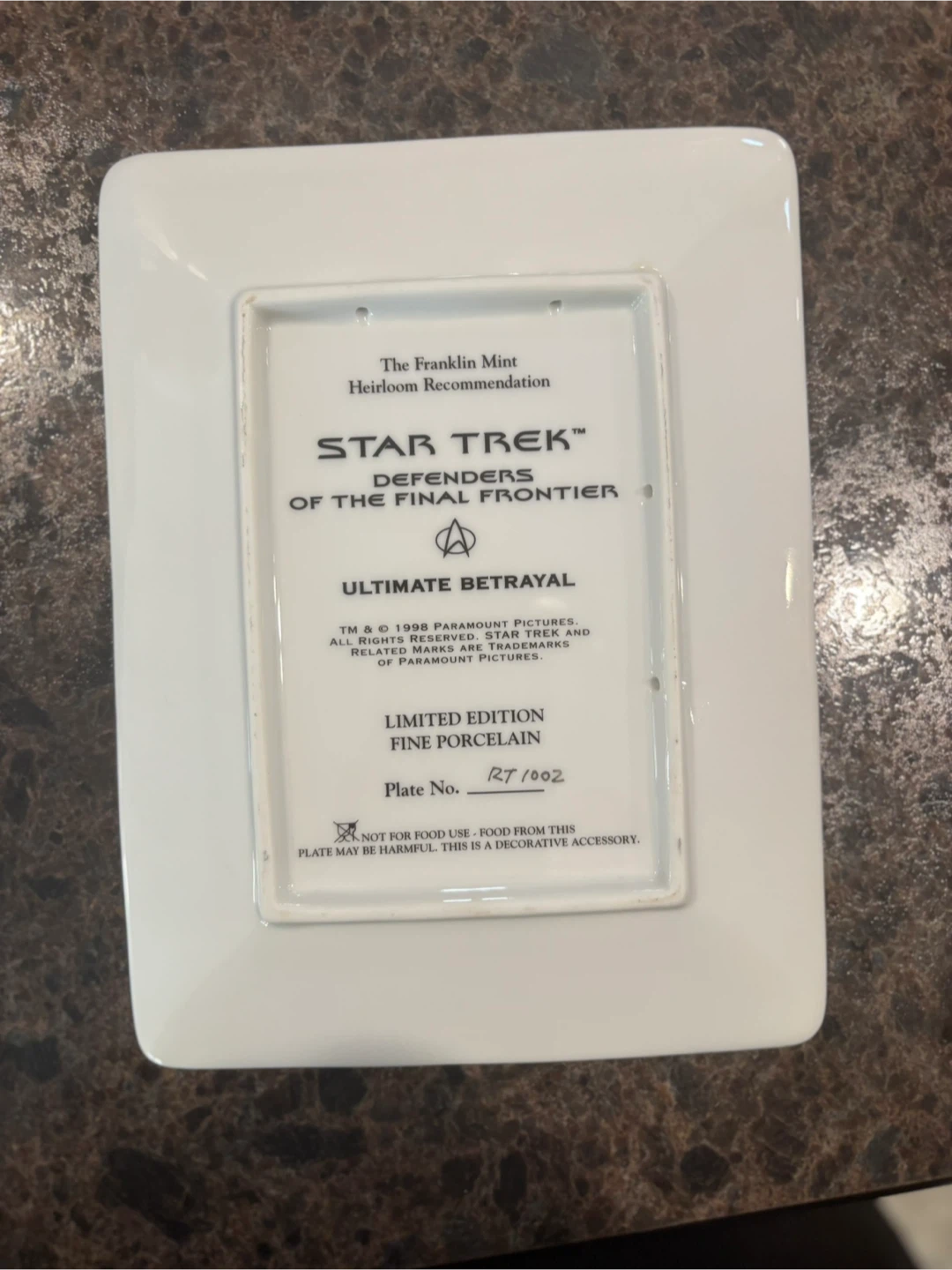 Selling the set of 3 Star Trek plates from The Franklin Mint Heirloom Recommendation series. It's a limited edition fine porcelain plate. This plate is a decorative accessory and is not for food use