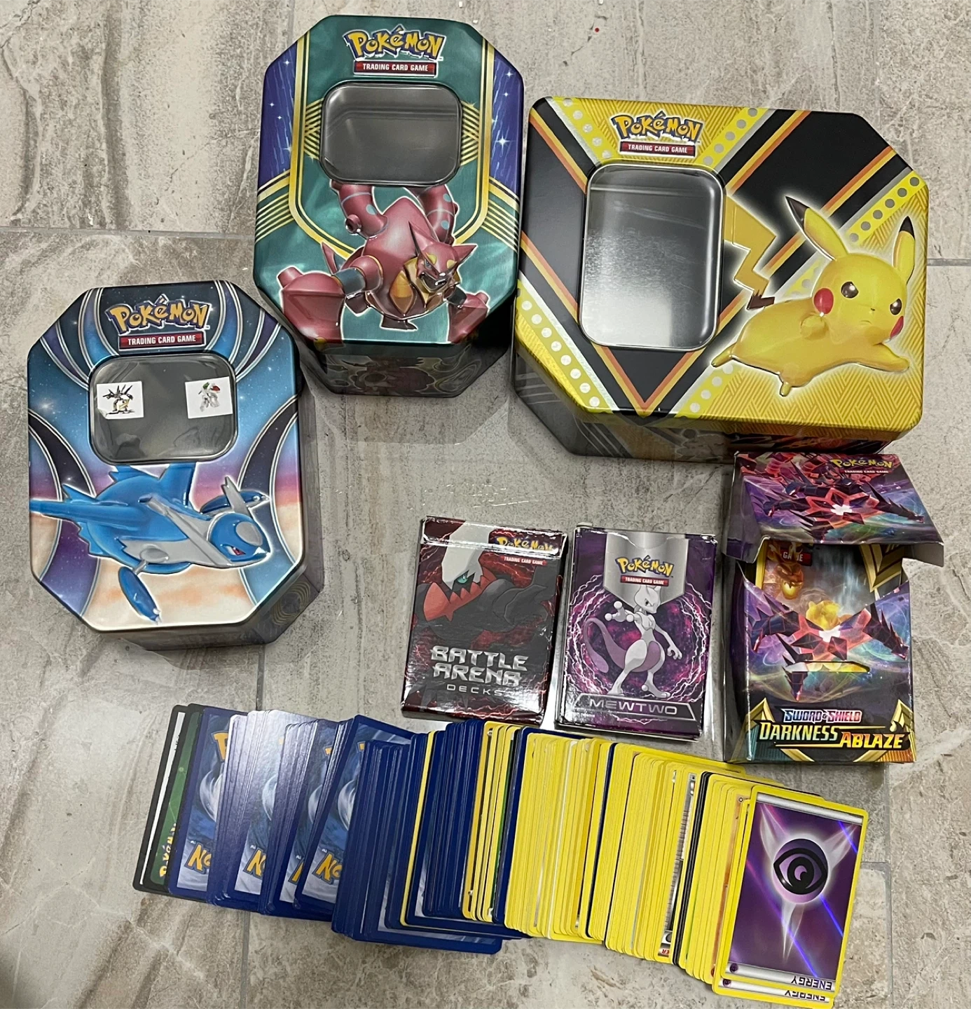 Selling a collection of Pokémon Trading Card Game items! Includes several tins featuring different Pokémon, along with decks and cards from various sets. Perfect for any Pokémon fan or collector!
