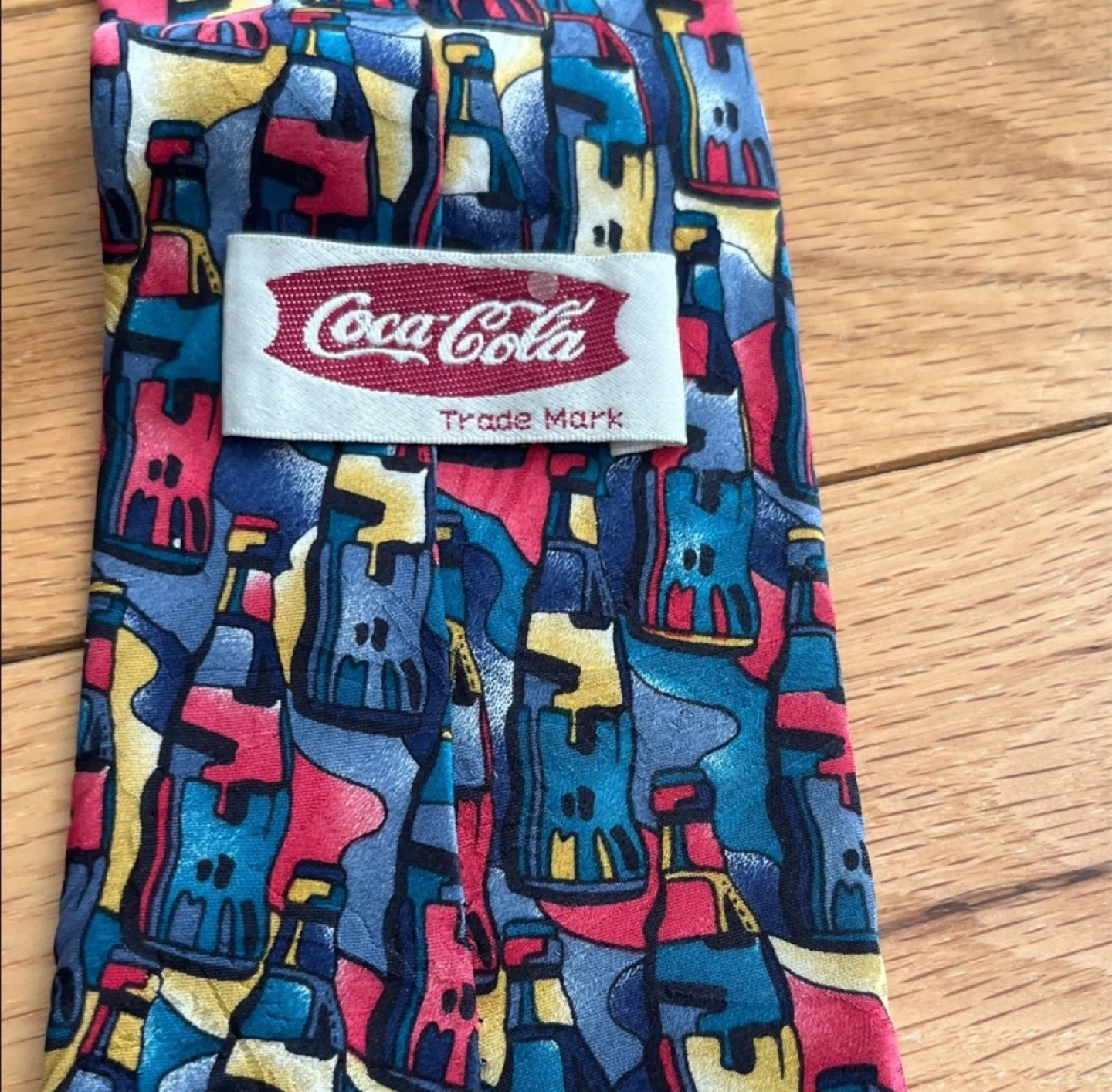 Here's a fun Coca-Cola tie! It's made of 100% silk and is hand sewn. The tie features a colourful pattern of Coca-Cola bottles. It shows some signs of wear.