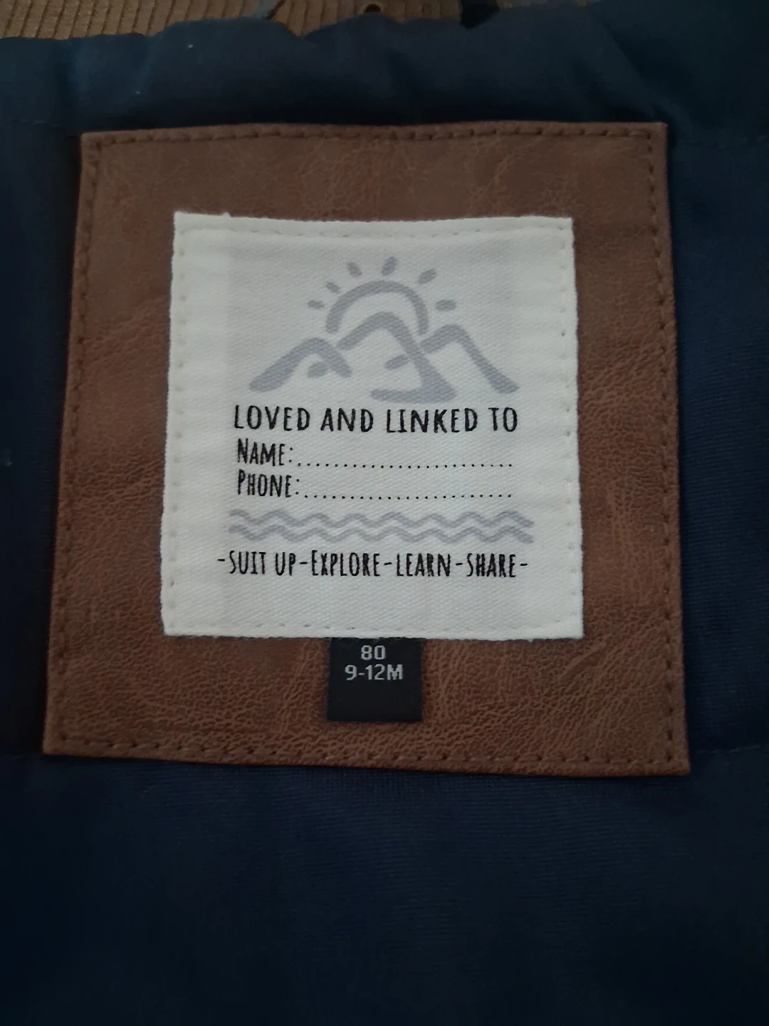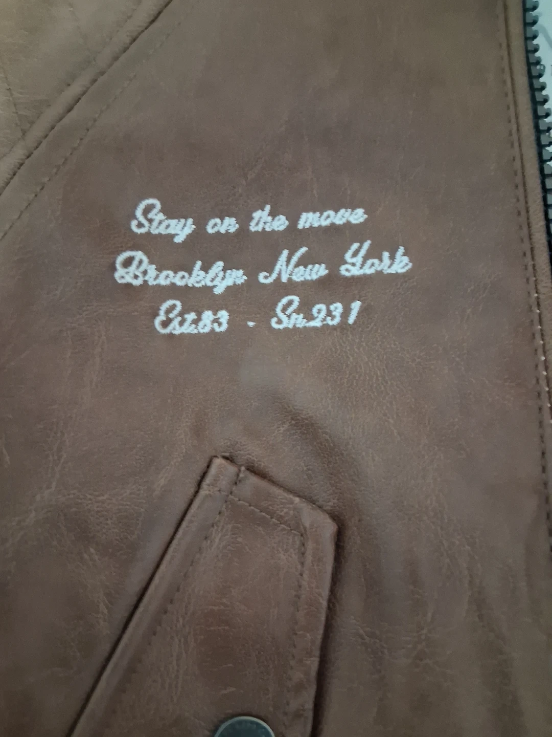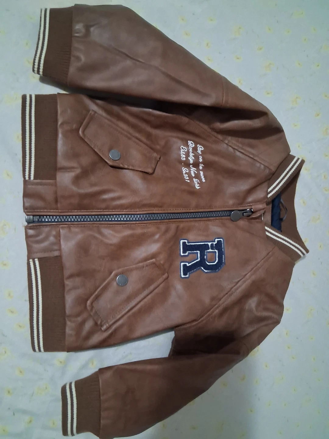 Here's a cute brown boy bomber jacket for your little one! The size is 9-12 months. It has a cool design with an 'R' patch and some embroidered text that says "Stay on the move Brooklyn New York Est.283 - Sn.231". Perfect for keeping them warm and stylish!