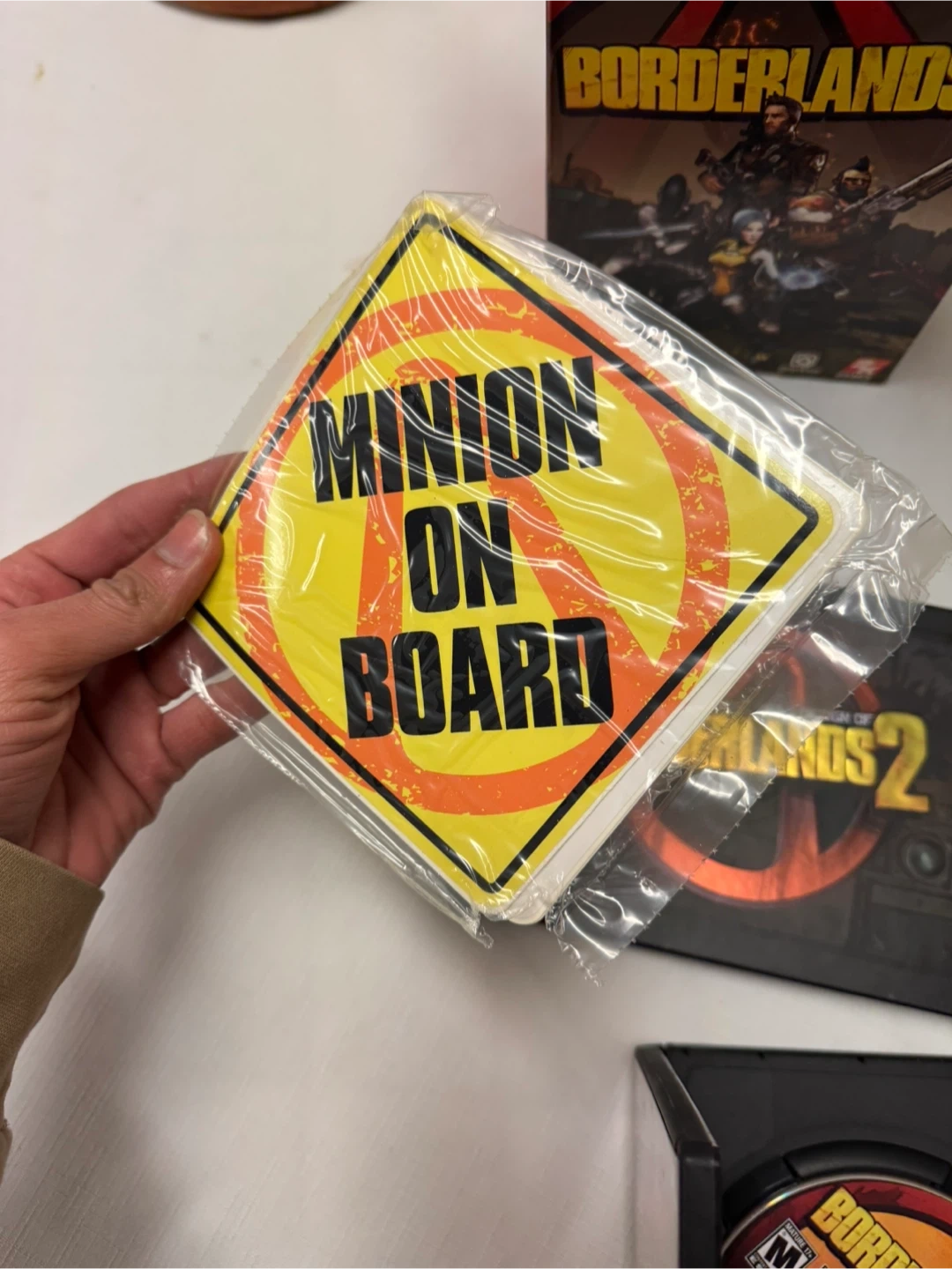 Selling a Borderlands 2 PC game set! It includes the game, a design book, and a Sir Hammerlock bobblehead in its original box. Also comes with a 'Minion on Board' sign!
