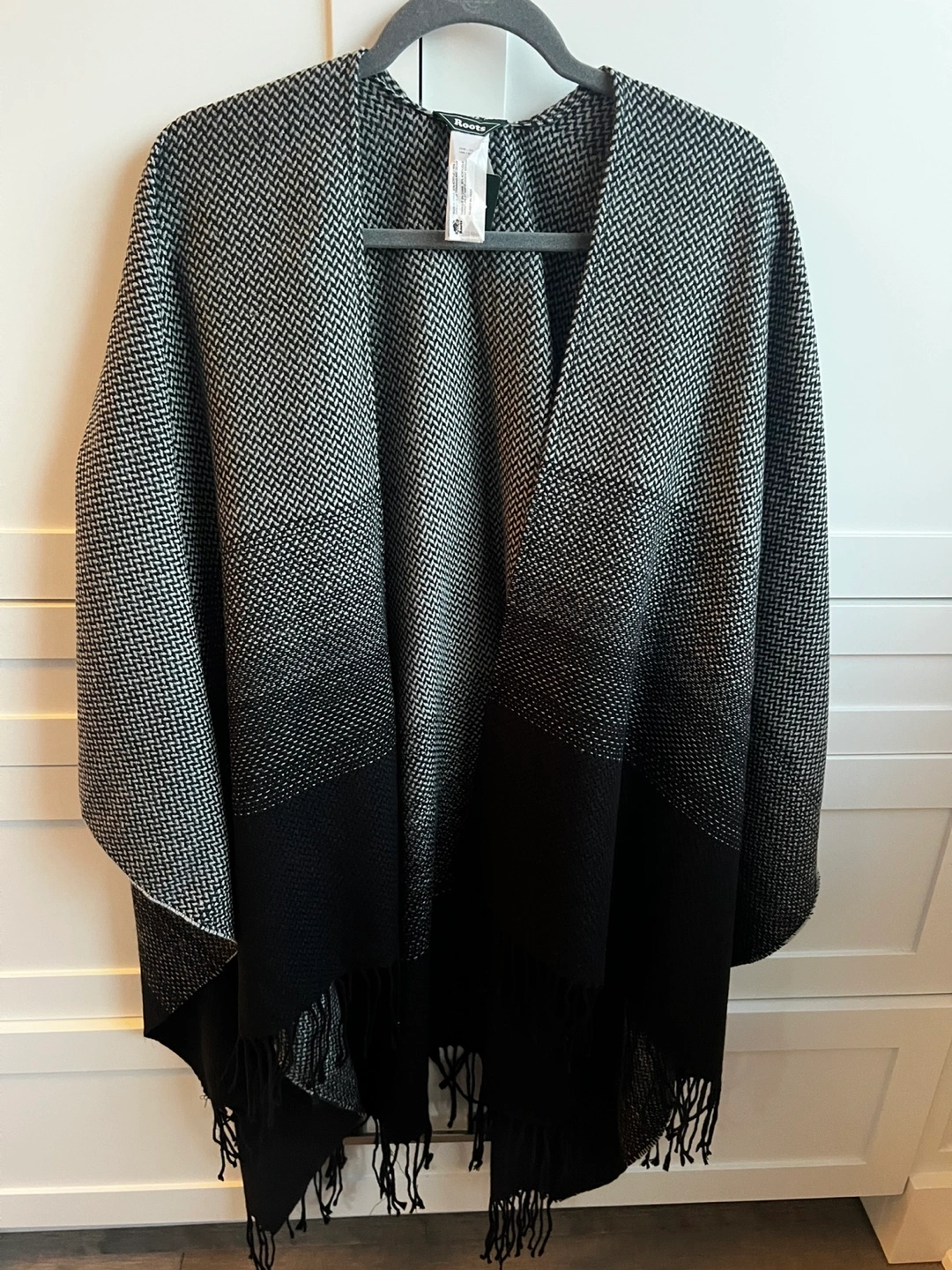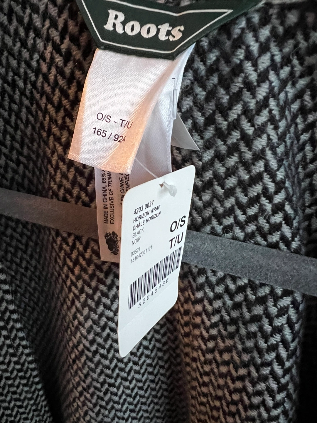 Selling a New Roots Horizon wrap size O/S. It's a stylish and cozy wrap that's perfect for layering! The material is soft and comfortable, and the design is versatile enough to pair with many outfits.