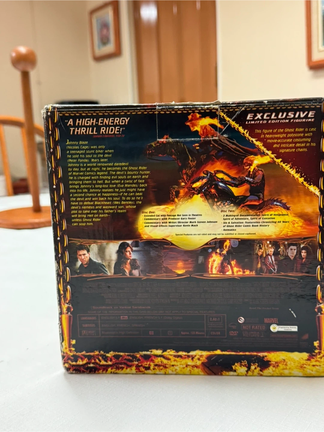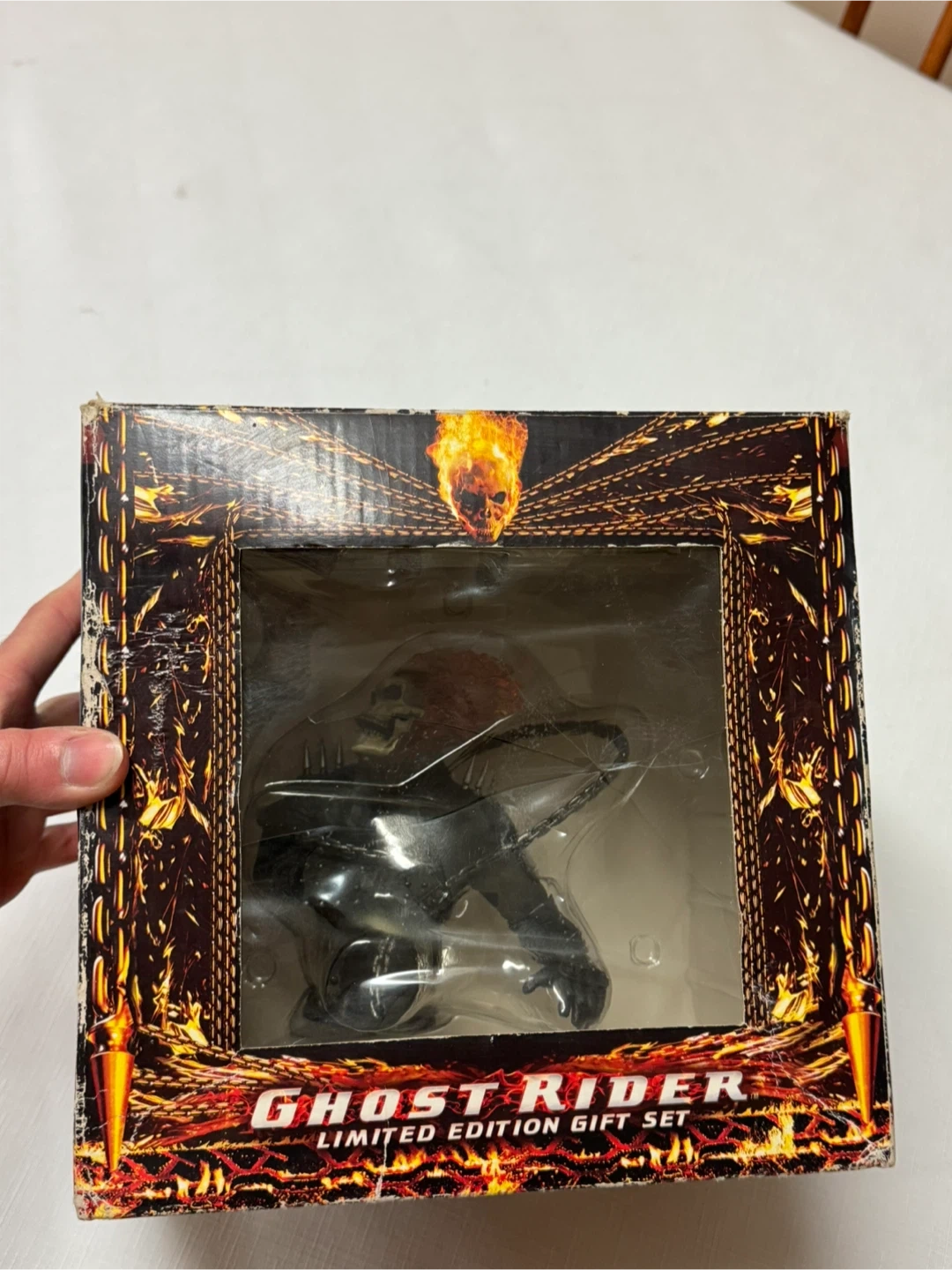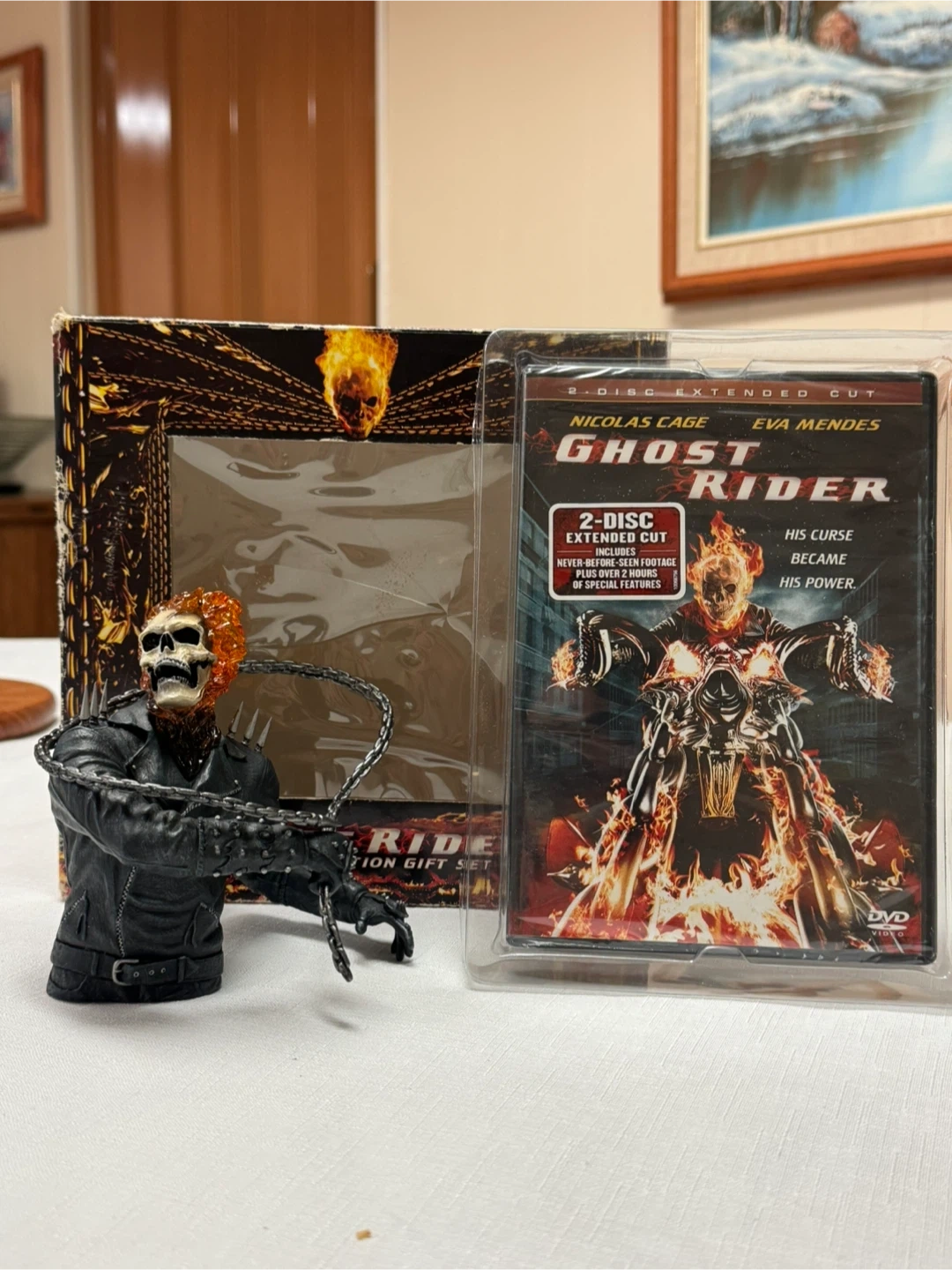 Selling a Ghost Rider Limited Edition Gift Set. It includes the figurine and the 2-Disc Extended Cut DVD. The figure is cast in heavyweight and movie-accurate costuming and intricately detailed in his signature chains