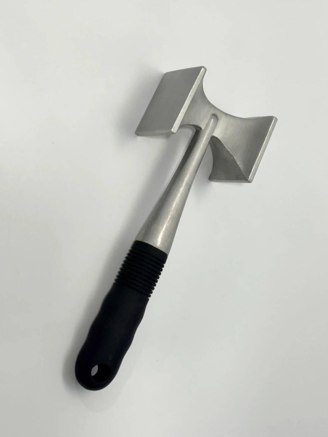 Farberware Professional Dual-Sided Rigid and Texture Stainless Steel Meat Tenderizer with Comfort Grip Handle. Great for pounding meat, shellfish, and nuts. It is also dishwasher safe.