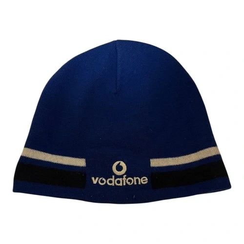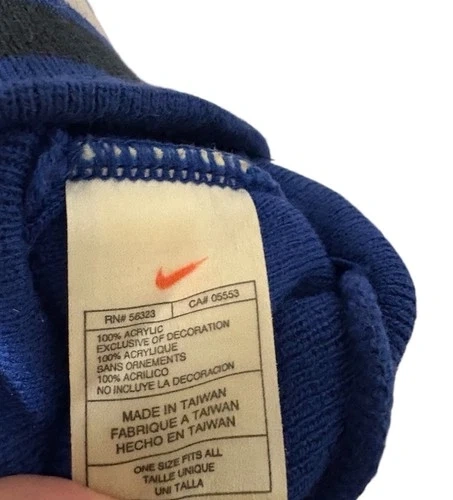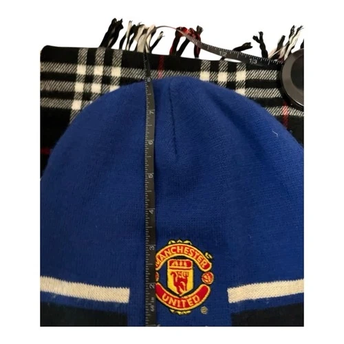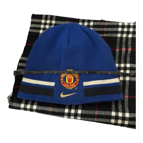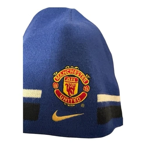 Blue beanie featuring Manchester United emblem. Includes Nike swoosh and black and white stripes. Vintage Y2K