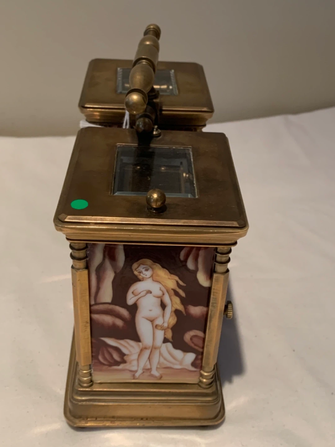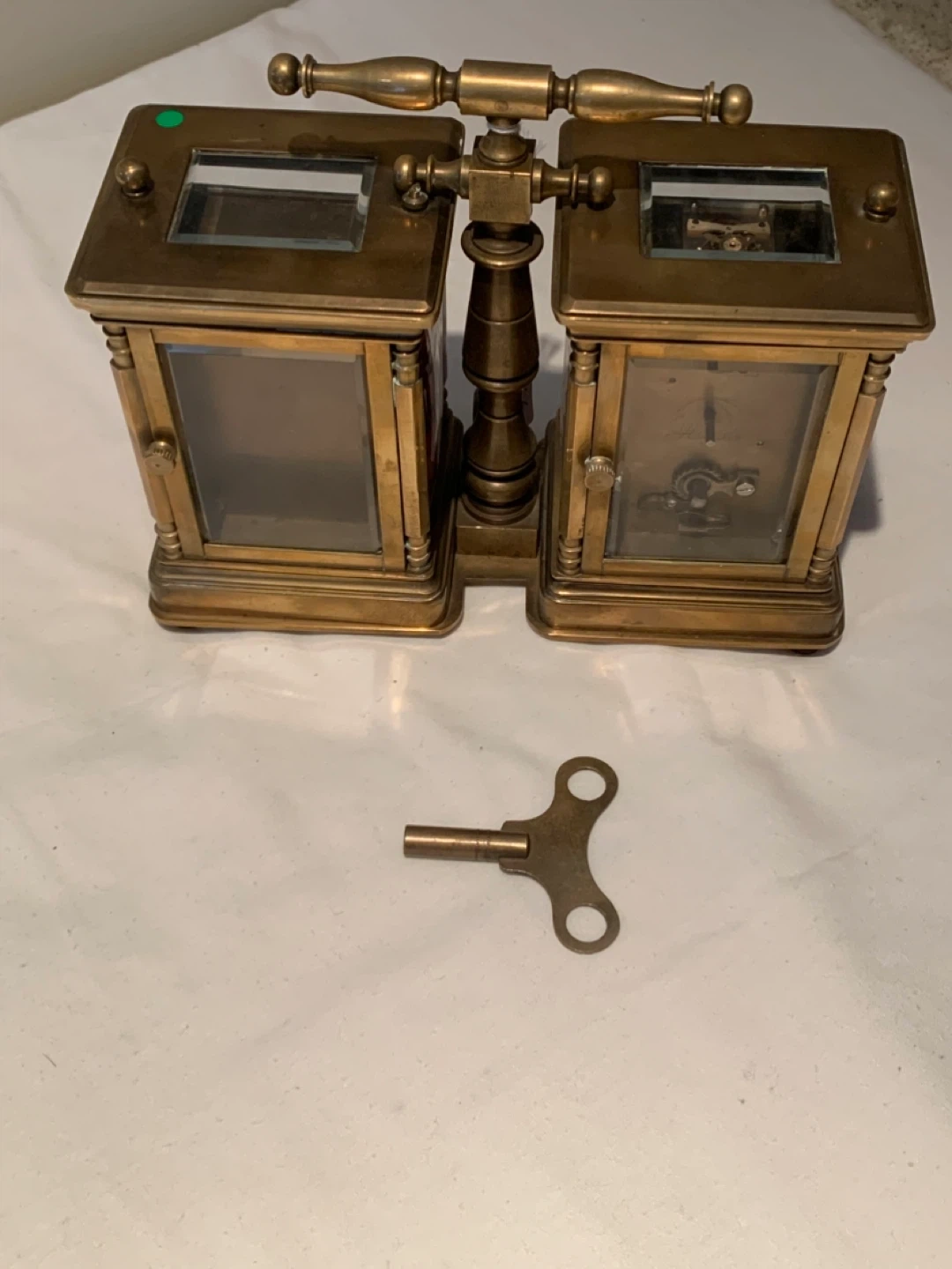 Selling a unique antique twin clock and barometer set! It comes with a key. The piece features ornate detailing and artwork on the sides. It's a beautiful piece for any collector or enthusiast!
