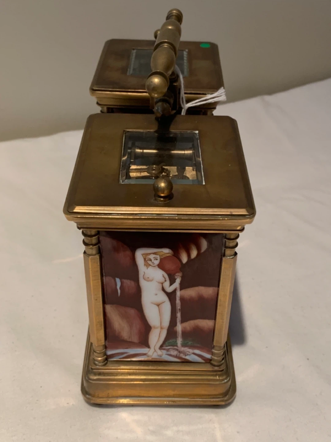 Selling a unique antique twin clock and barometer set! It comes with a key. The piece features ornate detailing and artwork on the sides. It's a beautiful piece for any collector or enthusiast!