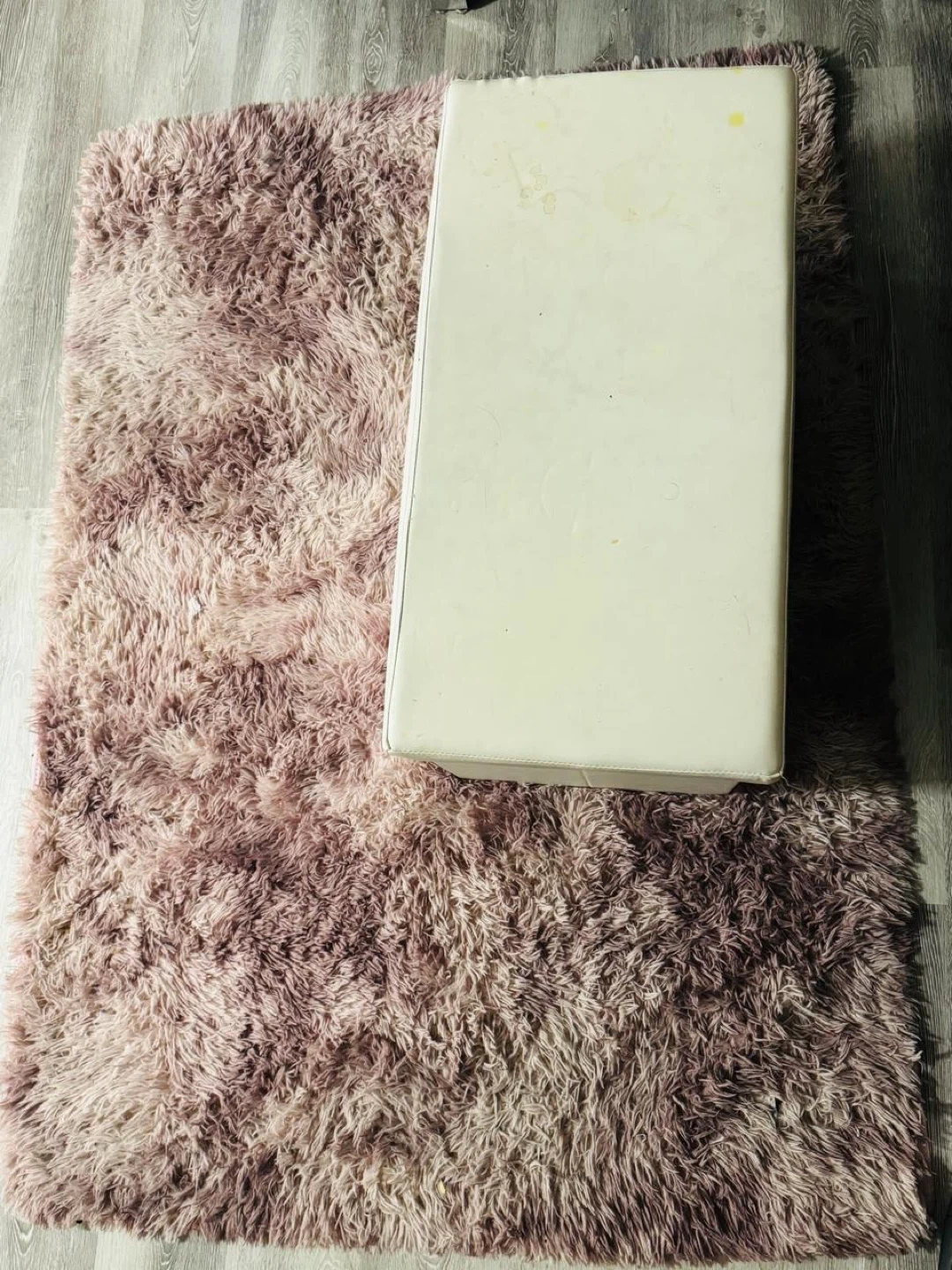 Selling a white storage ottoman! And pink large size rug .It's perfect for tidying up your space and adding a bit of extra seating. Great for storing blankets, books, or anything else you want to keep out of sight
