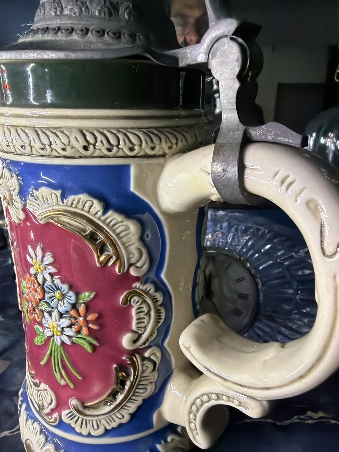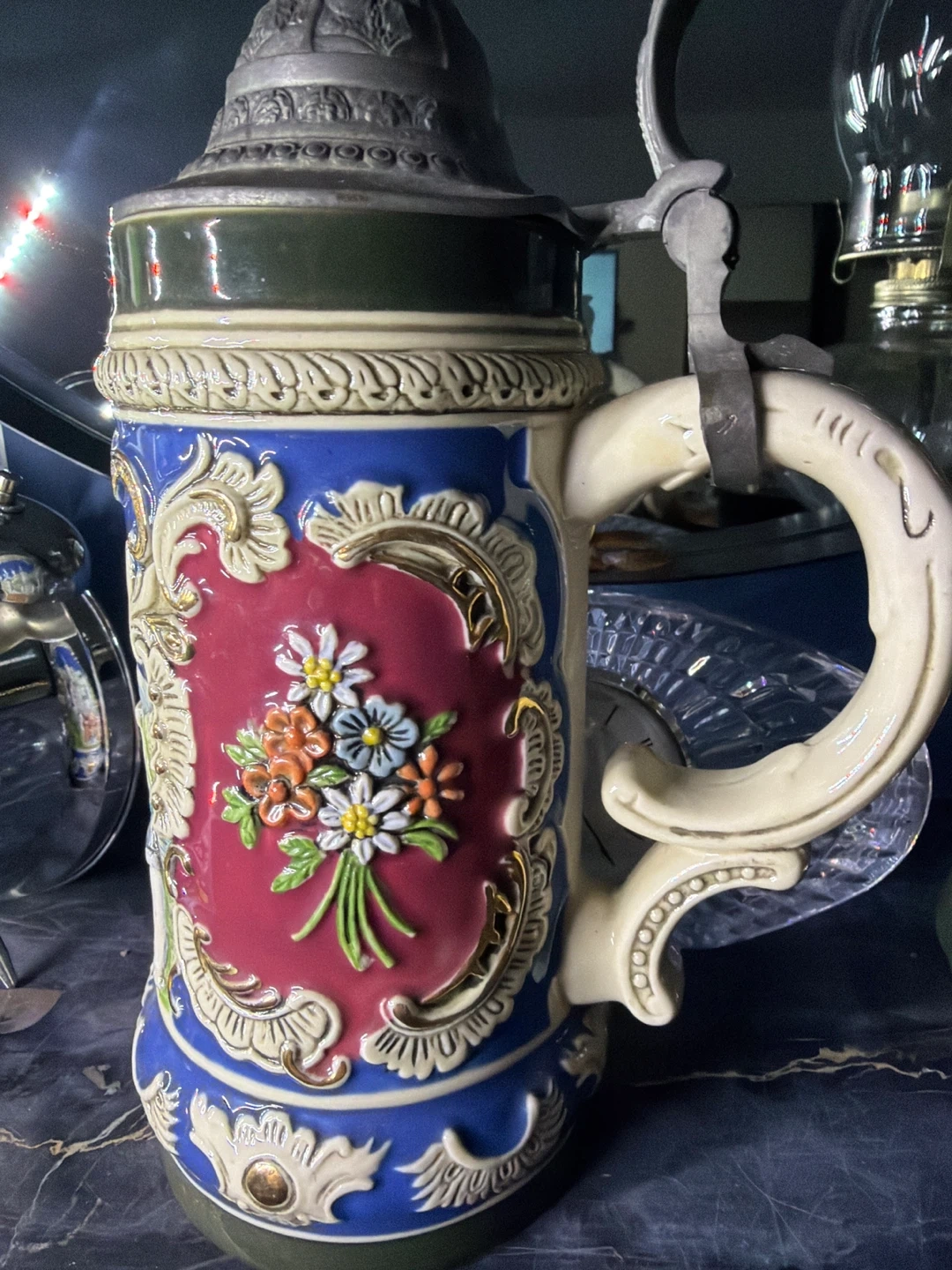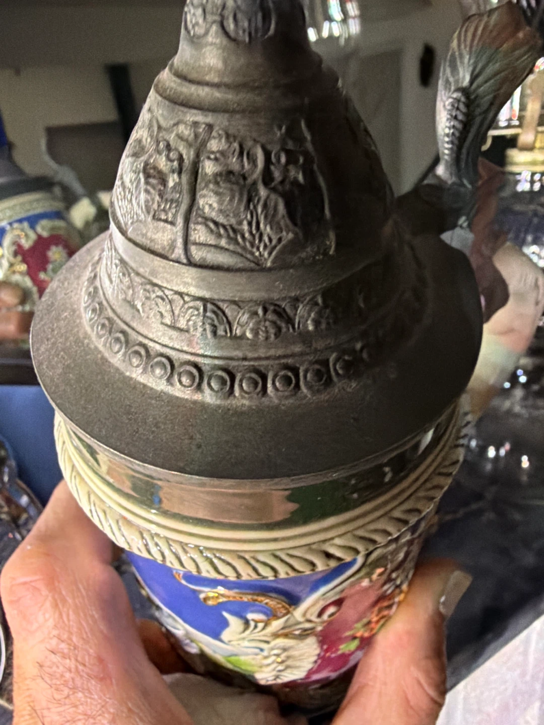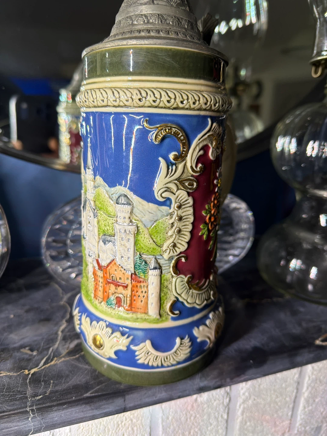 Selling a beautifully detailed vintage German beer stein. It features intricate designs with a pewter lid and a comfortable handle. Perfect for collectors or anyone who appreciates unique drinkware!