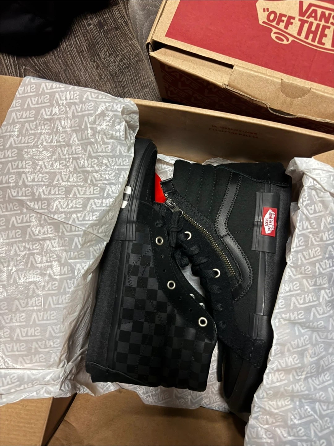 Here are some Vans SK8-Hi Reconstruct shoes in black. They come with the original box