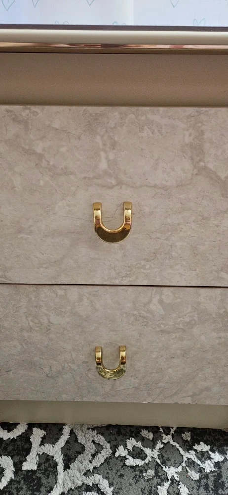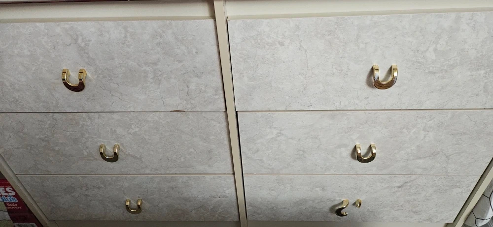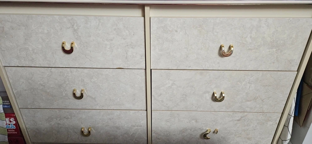 Here's a dresser with a unique marble-look finish and stylish gold handles. It has six drawers, providing ample storage space. It's a great addition to any bedroom or living area!