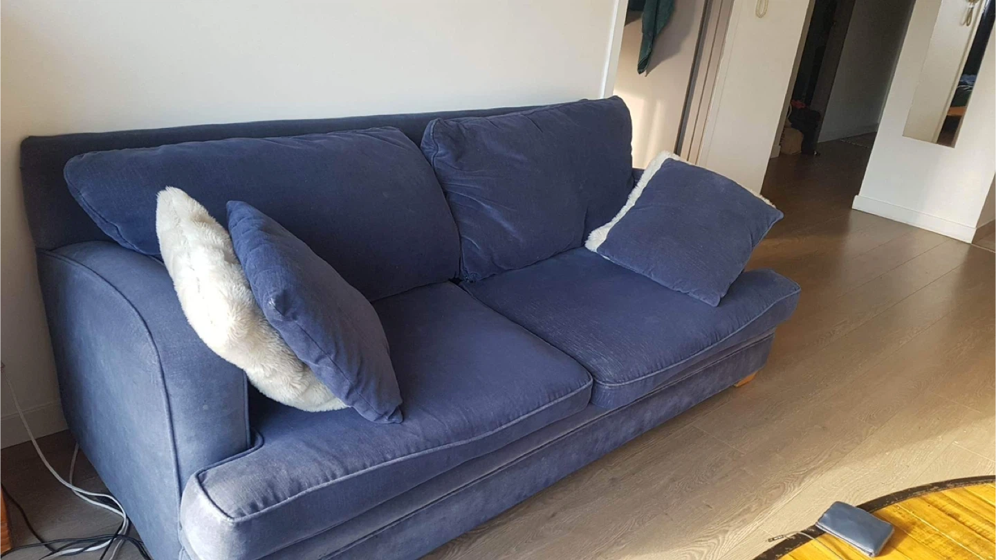 Selling a comfy blue sofa that's in great condition! It's perfect for a living room or den. The colour is a lovely deep blue. It's a great size for lounging and relaxing after a long day. If you're looking for a cozy addition to your home, this sofa is a great choice!