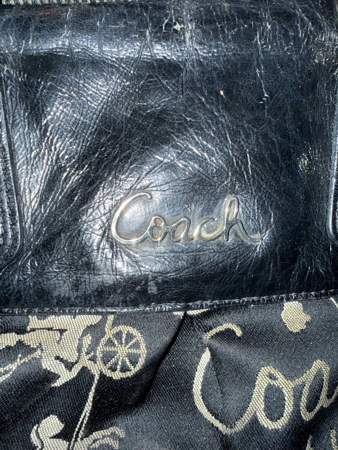 Selling a Coach satchel bag with a black patterned design! It has a zip closure and handles, perfect for everyday use. The bag shows some signs of wear, but still has lots of life left!