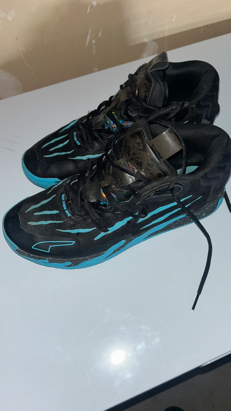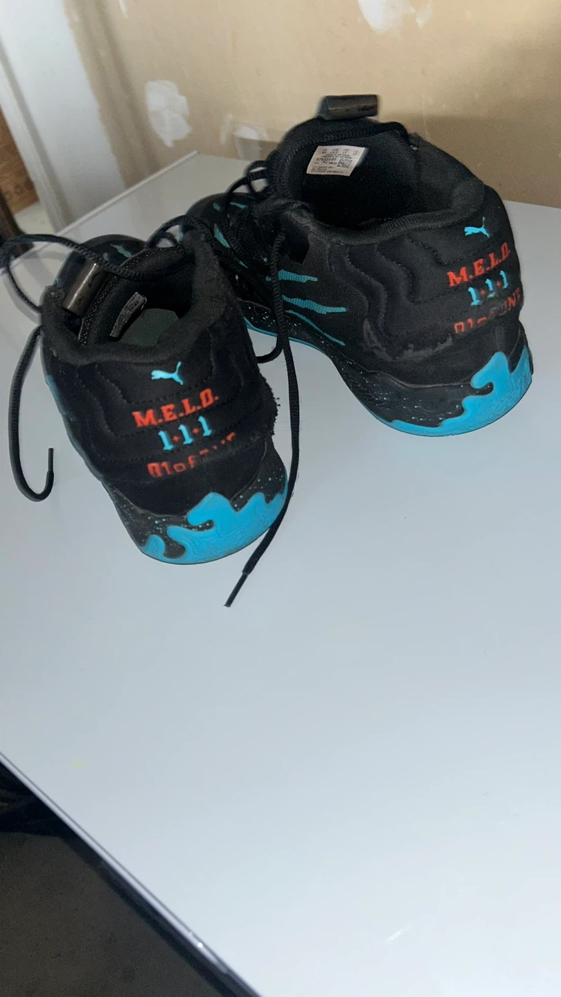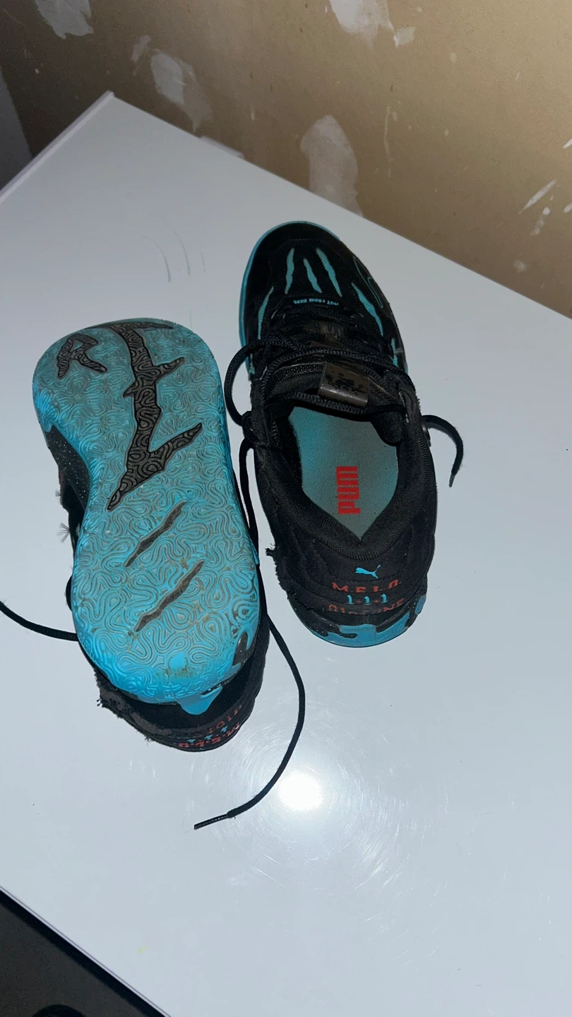 Selling a pair of Puma Melo 1.1.1 01of 500 shoes. They are black with turquoise accents. They show some signs of wear.