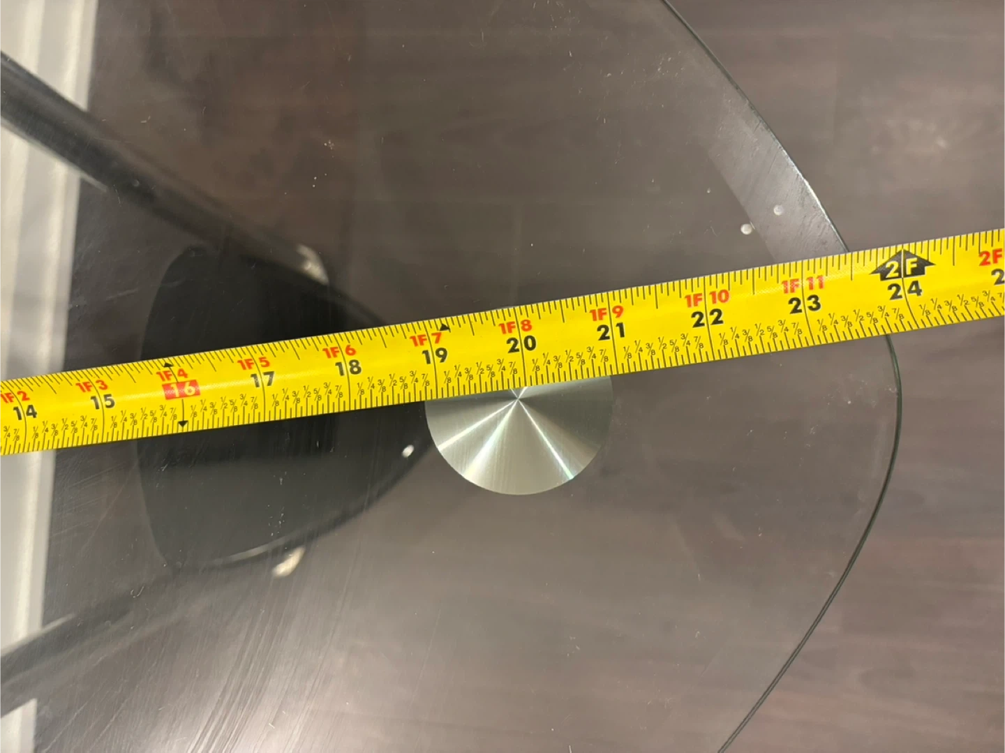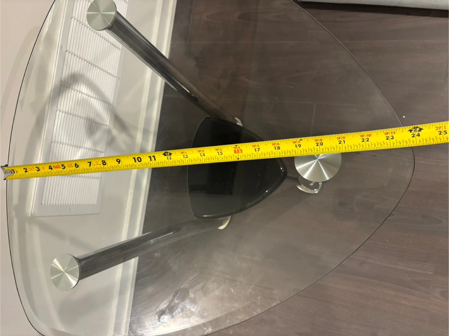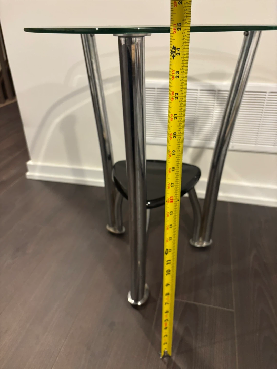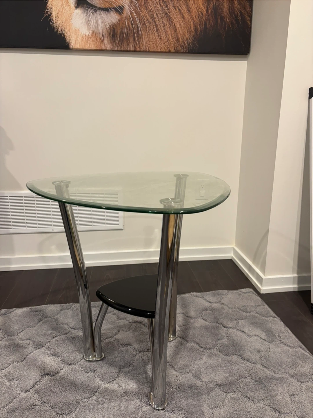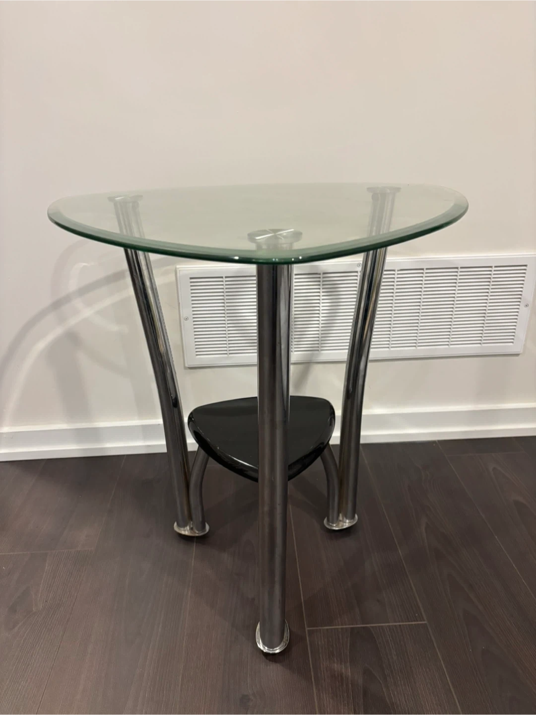 Selling a glass top end table with a triangular black shelf. It's in good condition and would be a great addition to any living room or bedroom. The table stands approximately 25 inches tall and the glass top is about 24 inches wide.