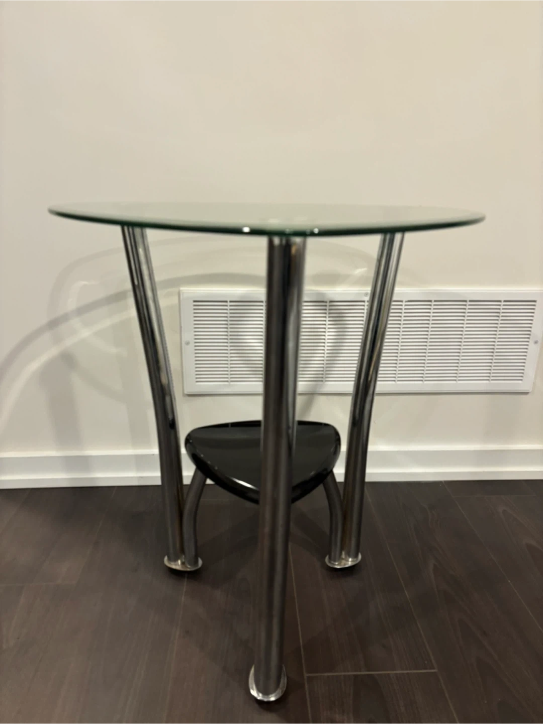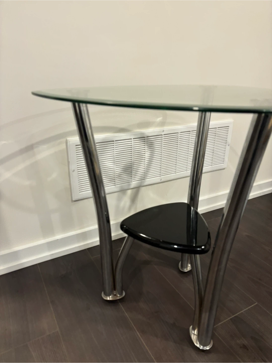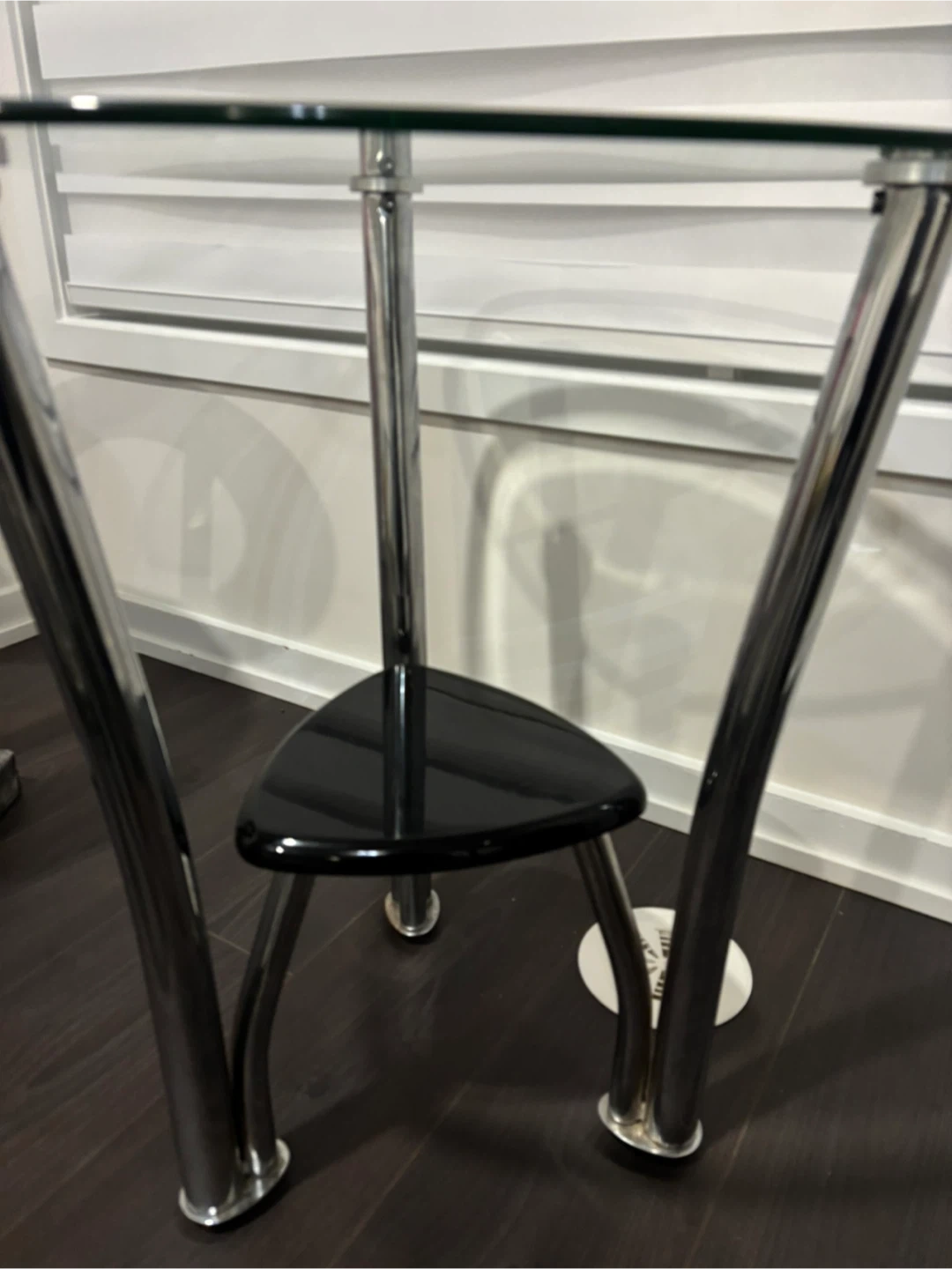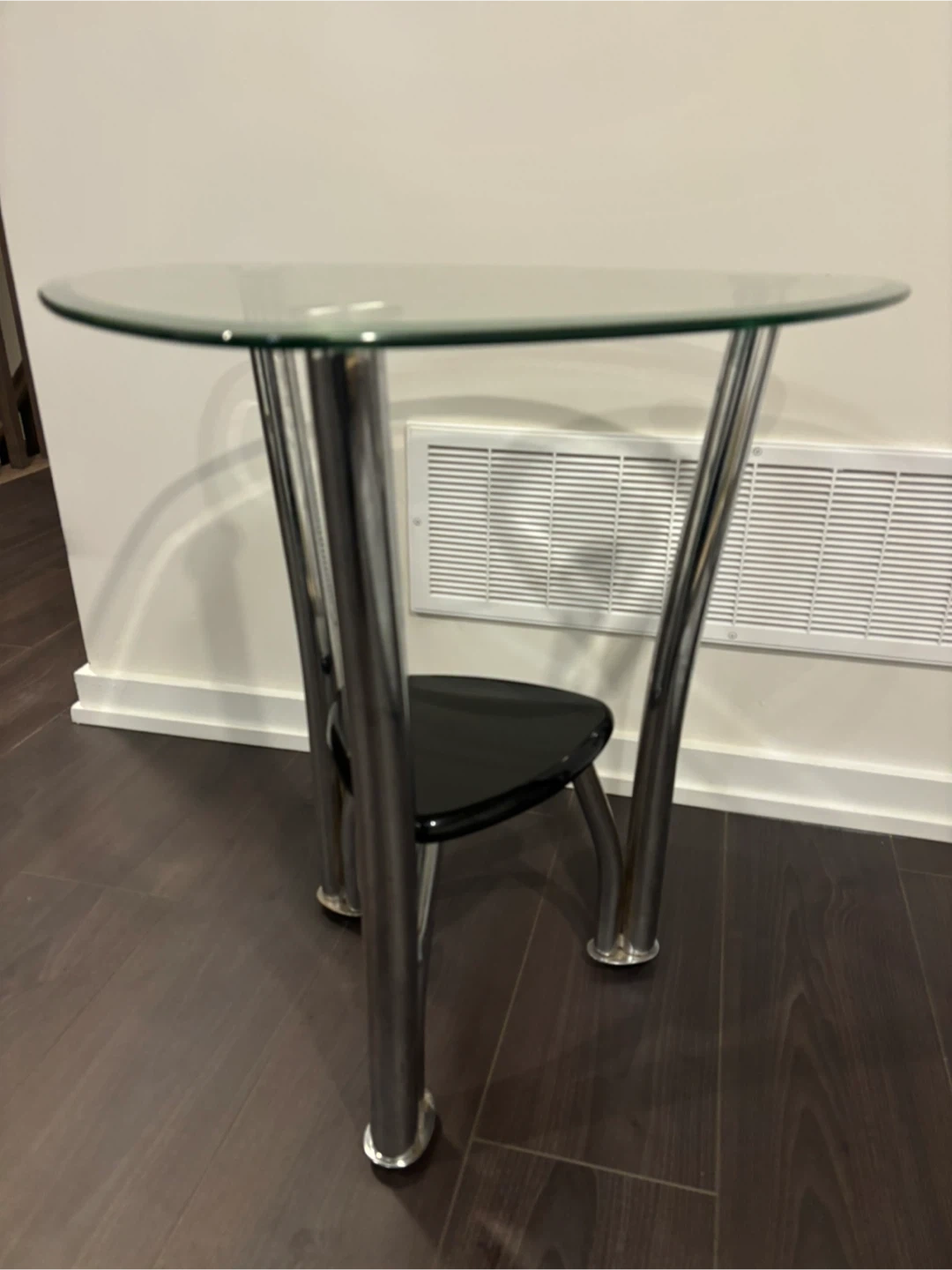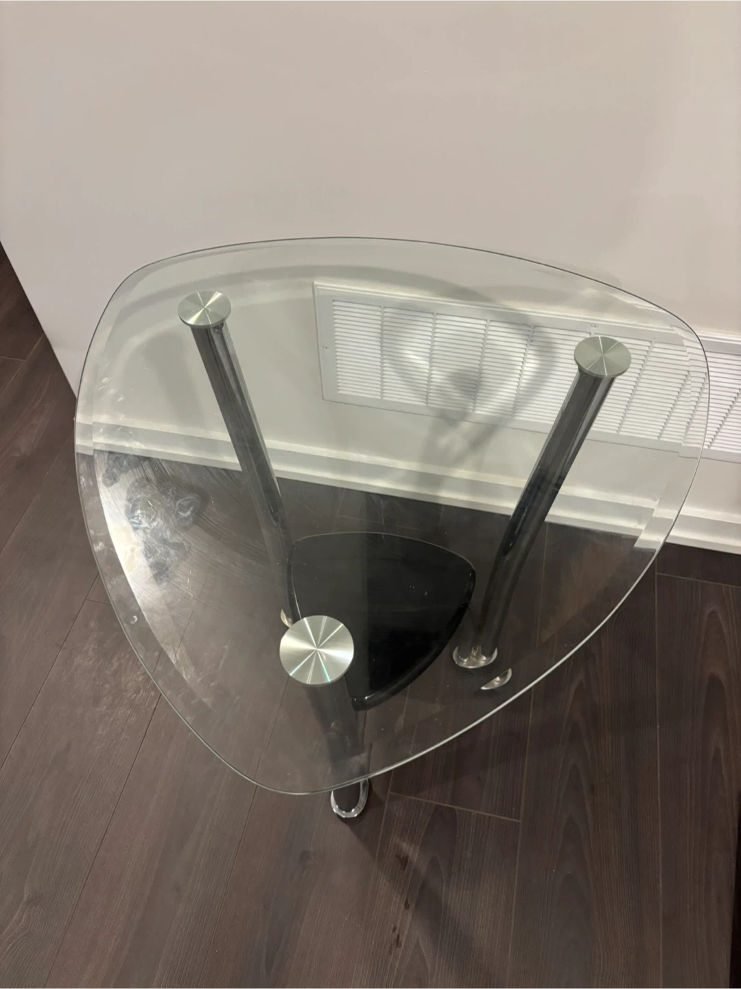 Selling a glass top end table with a triangular black shelf. It's in good condition and would be a great addition to any living room or bedroom. The table stands approximately 25 inches tall and the glass top is about 24 inches wide.