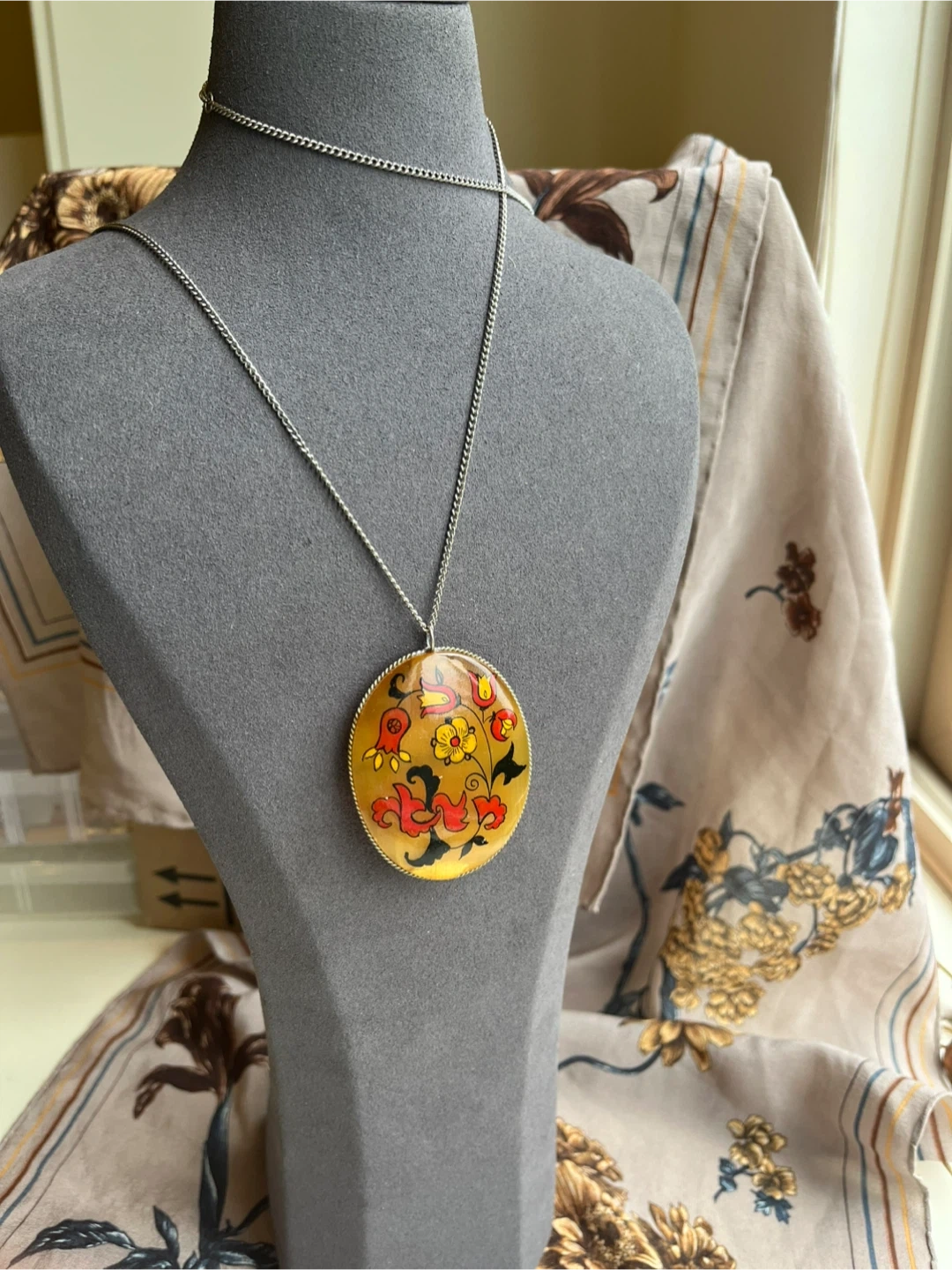 Beautiful large USSR/Russian folk art selenite pendant, hand painted hand-enameled from the 1960s. Highly collectible. On silver chain.