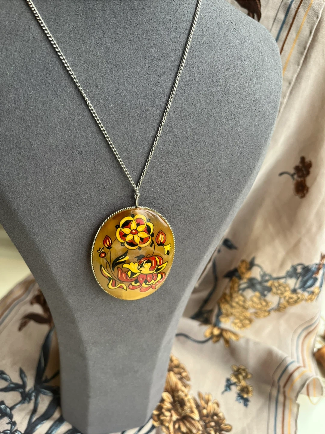 Rare 1960s Hand Painted Enamel Folk Art Selenite Pendant
