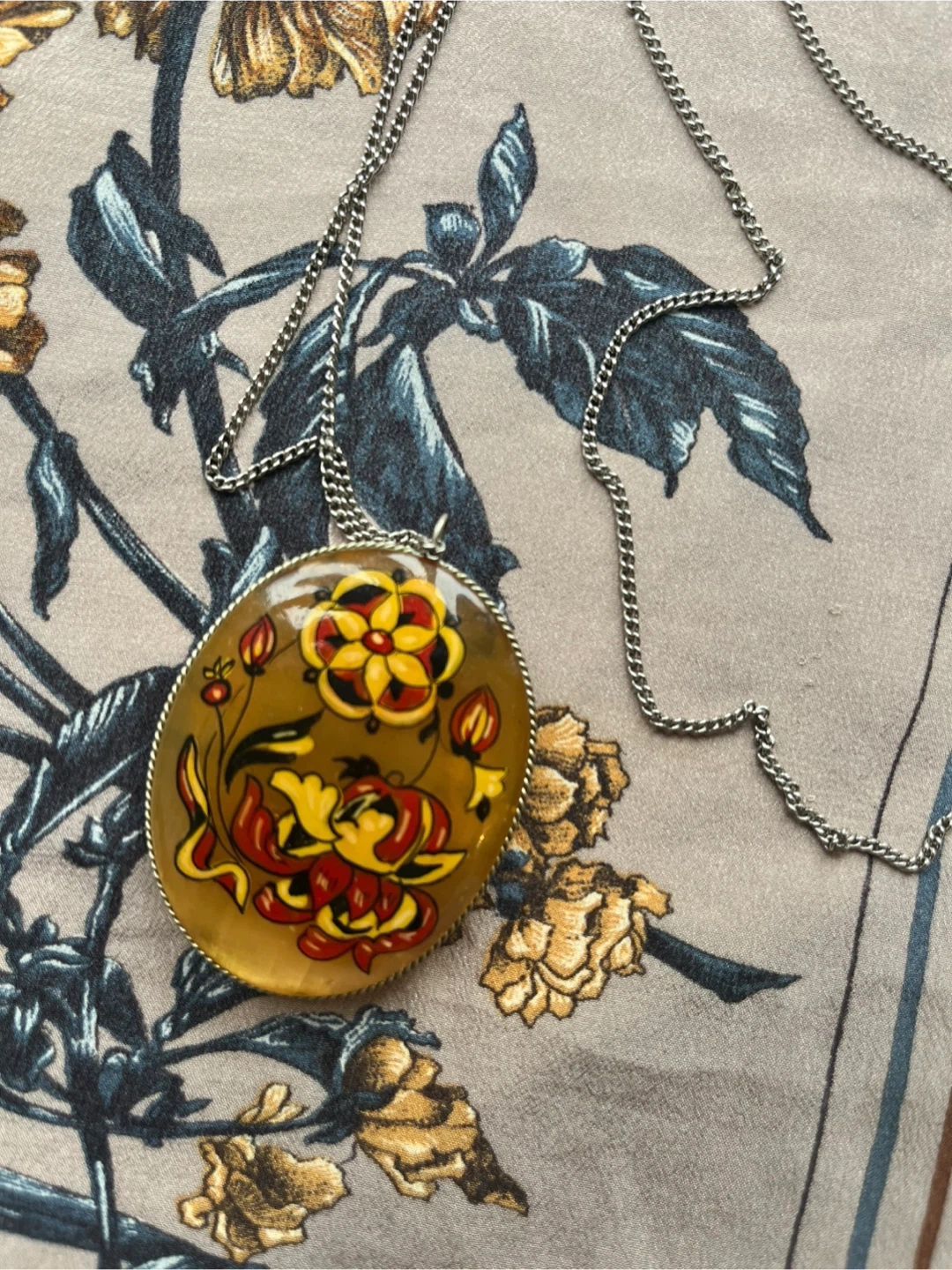 Beautiful large USSR/Russian folk art selenite pendant, hand painted hand-enameled from the 1960s. Highly collectible. On silver chain.