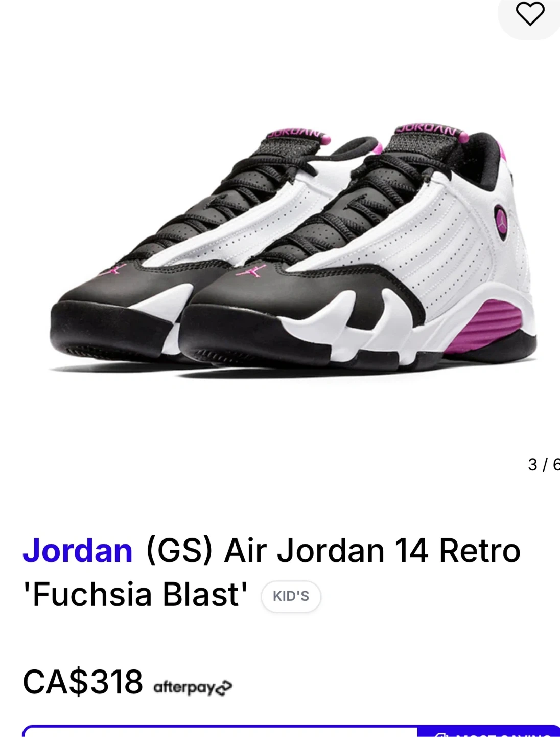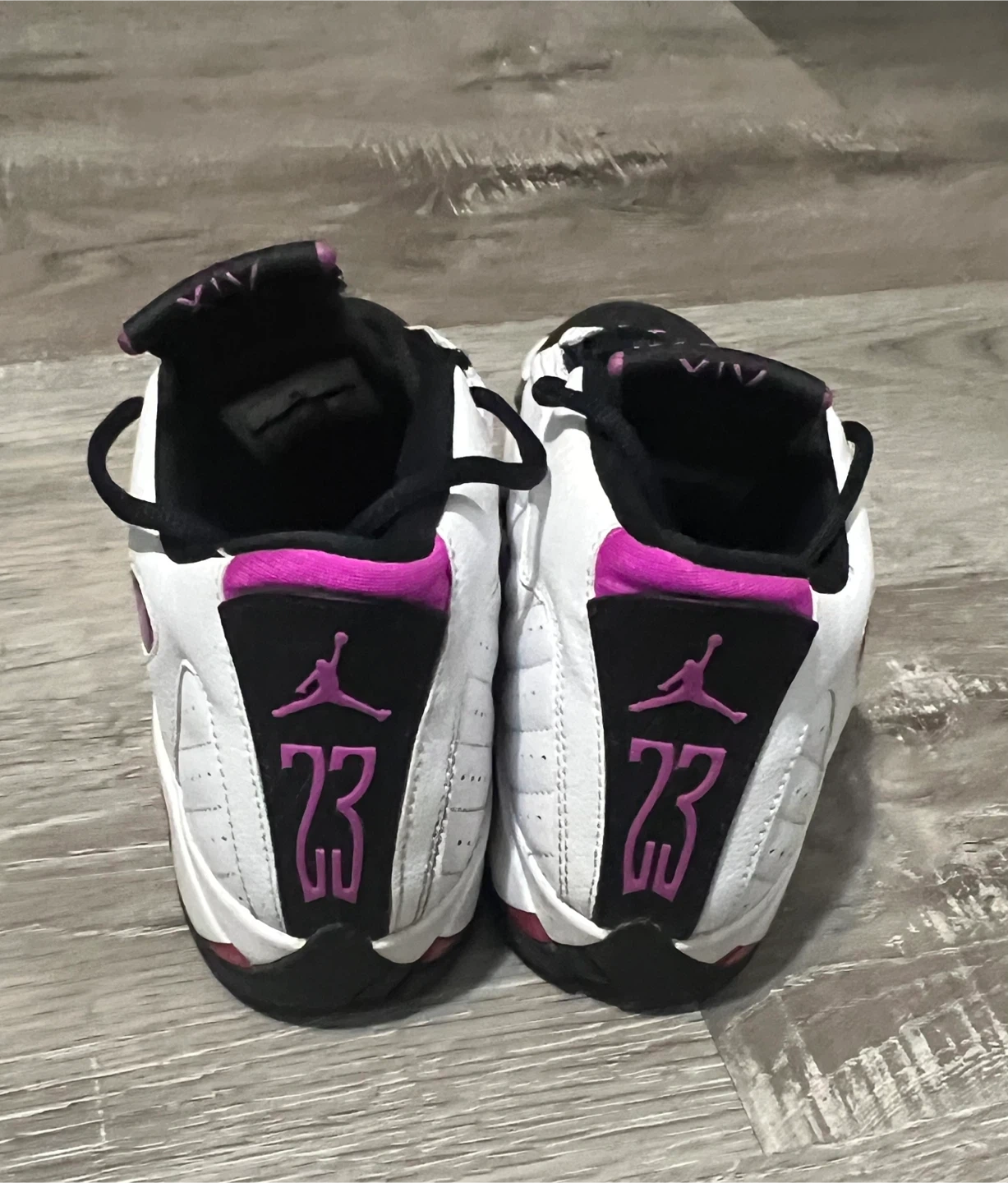 Selling a pair of Jordan Air Jordan 14 Retro 'Fuchsia Blast' in size 6.5Y. They are in good condition and ready for a new owner! The shoes feature a stylish black, white, and fuchsia colourway. The size is US 6.5