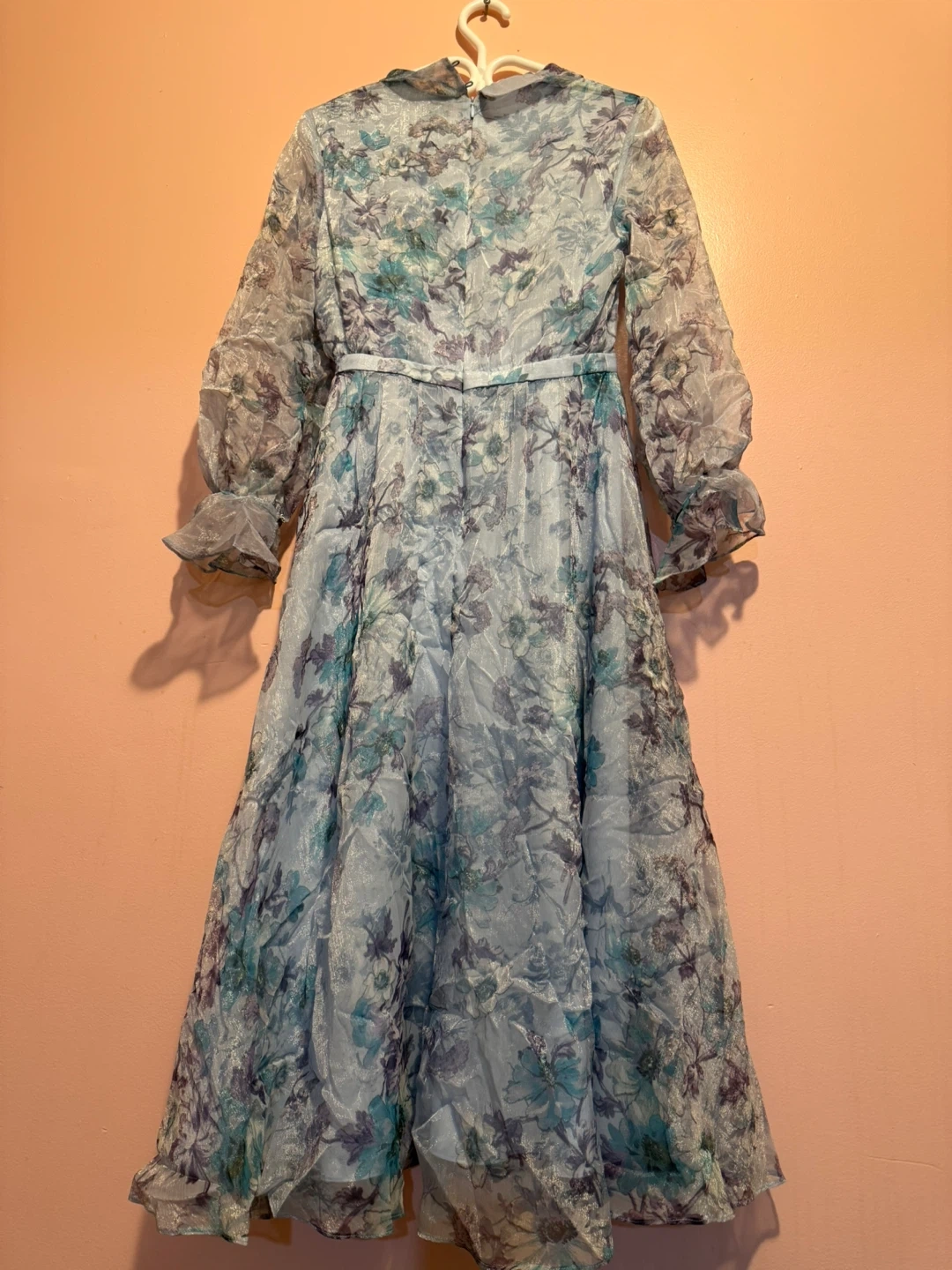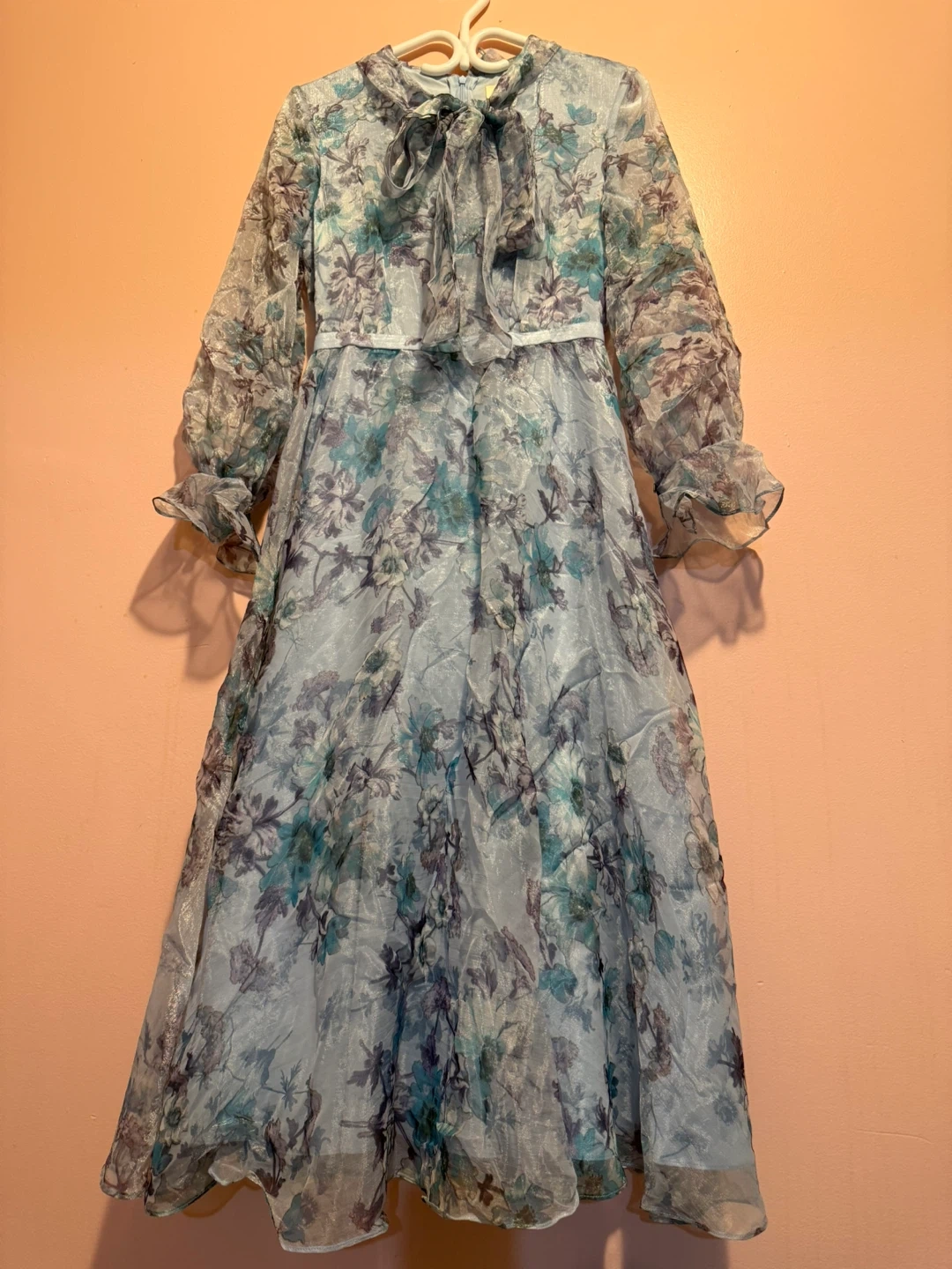 Beautiful floral print maxi dress in excellent condition! The dress features long sleeves with ruffled cuffs and a tie neck detail. Perfect for a special occasion or a stylish everyday look