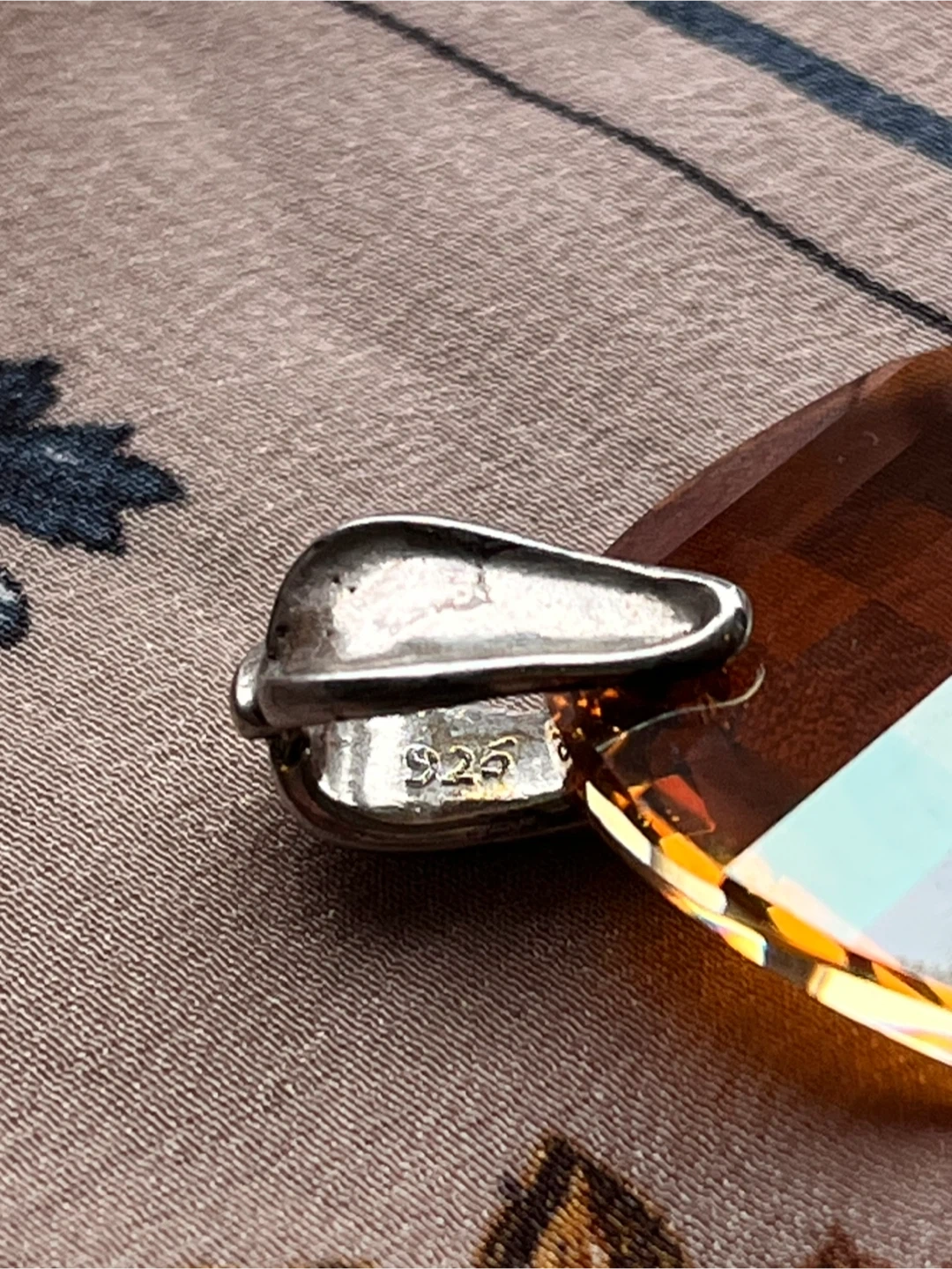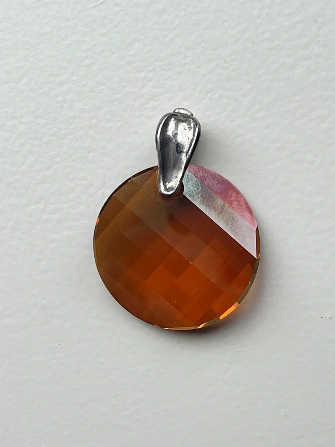 Selling a beautiful orange crystal pendant with a 925 silver bail. The crystal is faceted and catches the light nicely. It's in great condition and ready to be worn!