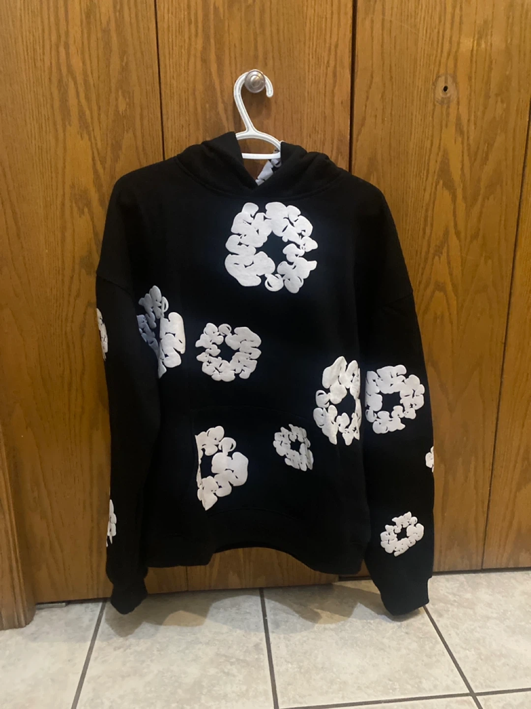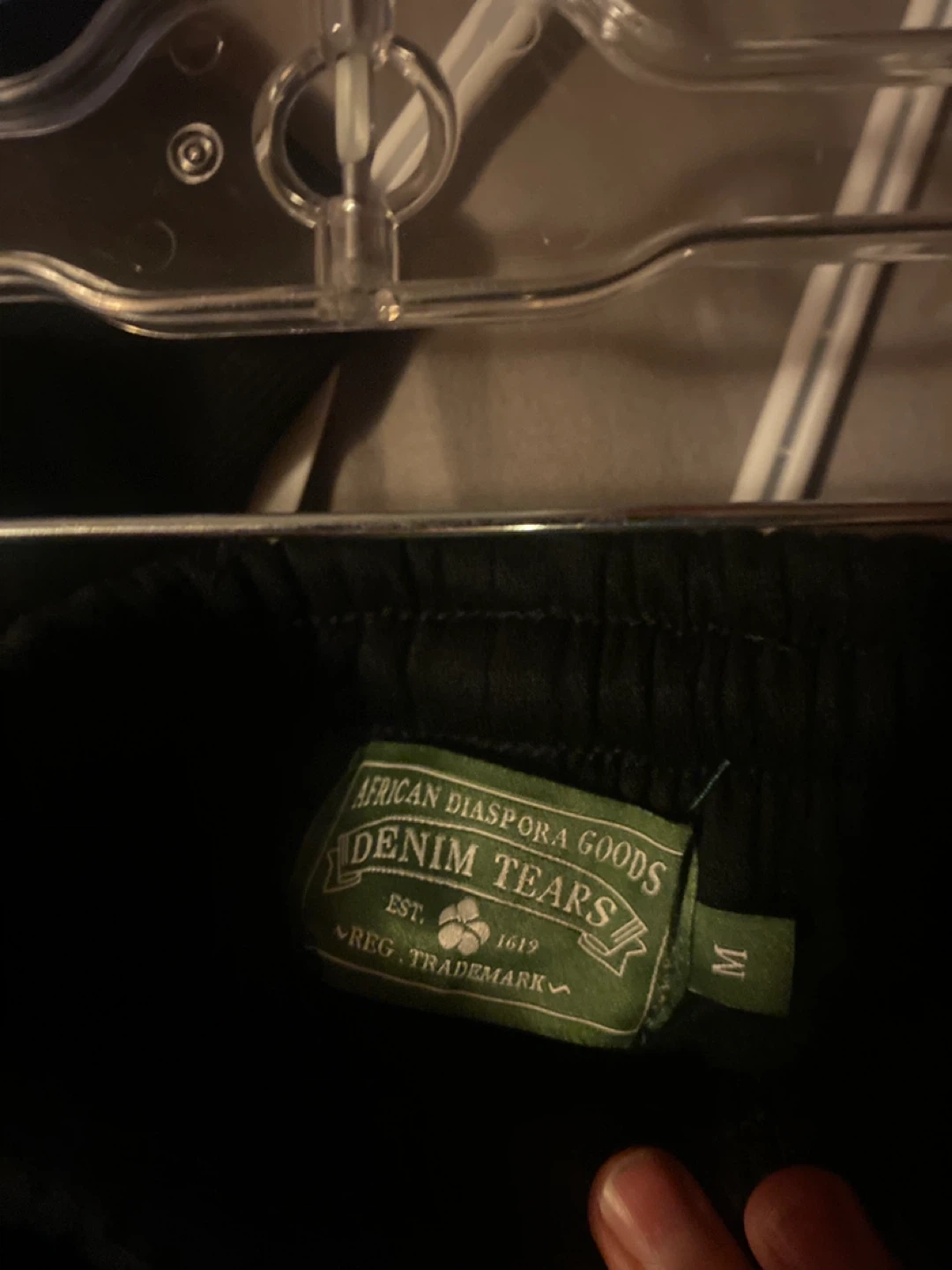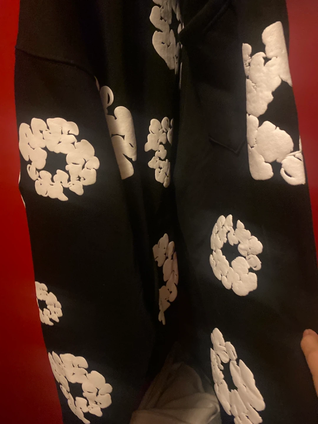 Selling a denim tears hoodie and sweatpants color is black and white quality is 1-1 hoodie is a small but fits like a medium comes with tags but they are separate because worn once
