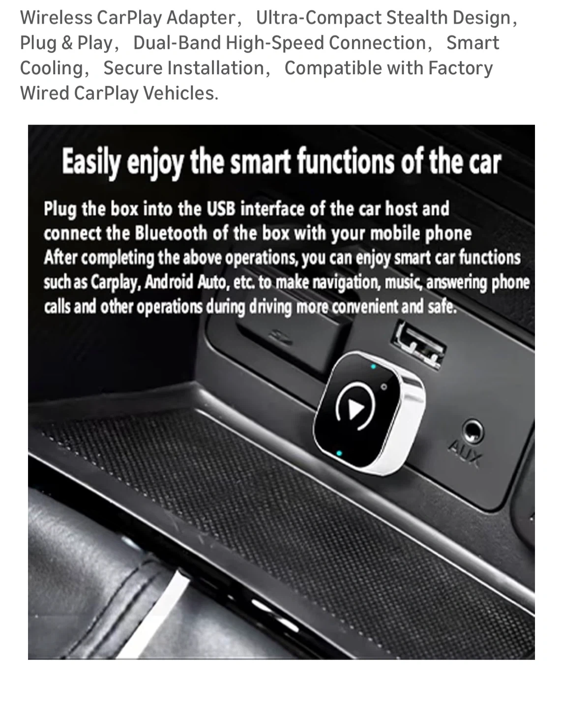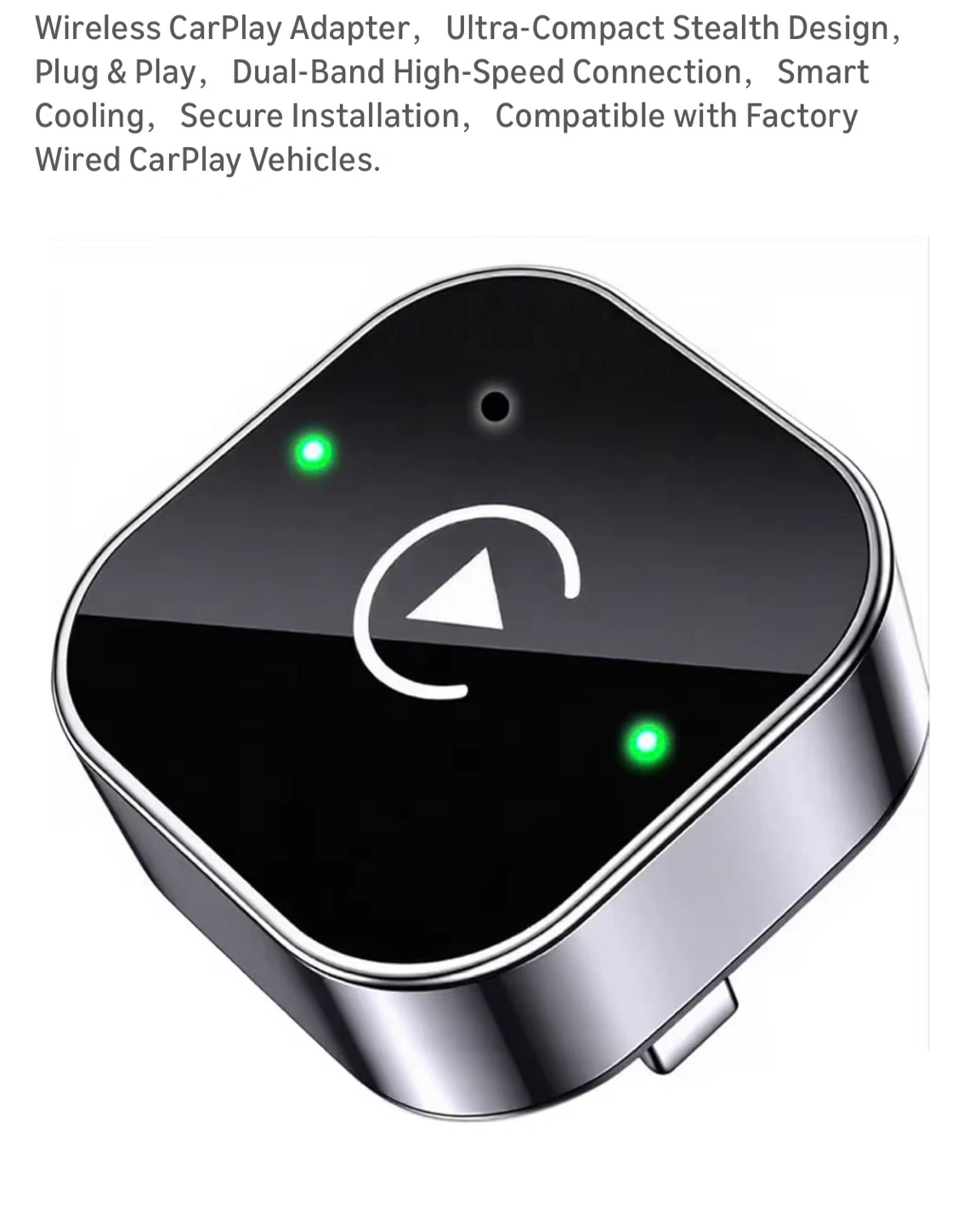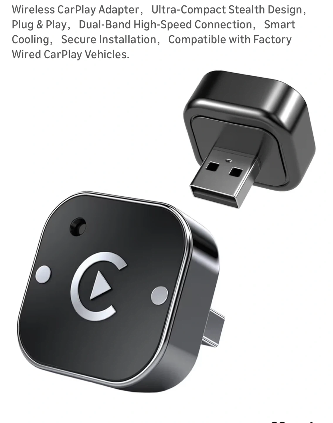 Wireless CarPlay Adapter,Ultra-Compact Stealth Design,Plug & Play,Dual-Band High-Speed Connection,Smart Cooling,Secure Installation,Compatible with Factory Wired CarPlay Vehicles.