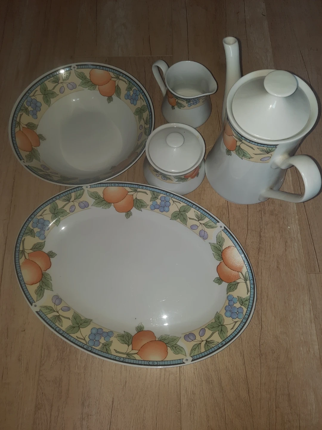 The set features a lovely fruit and floral design around the edges. Perfect for adding a touch of elegance to your dining table!