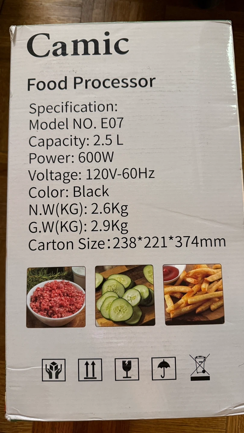 Camic professional food processor, model E07, in black. This food processor has a capacity of 2.5L and a power of 600W. It operates at 120V-60Hz. The carton size is 238*221*374mm