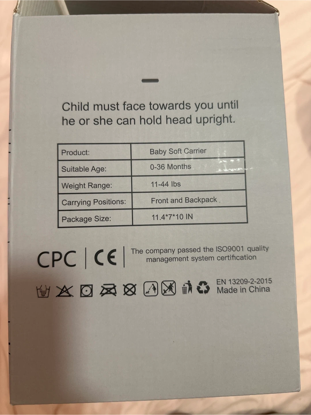 I'm selling a Little Aura Baby Soft Carrier! It's suitable for babies aged 0-36 months and can carry them in both front and backpack positions. It supports a weight range of 11-44 lbs. The package size is 11.4*7*10 IN. The box is included!