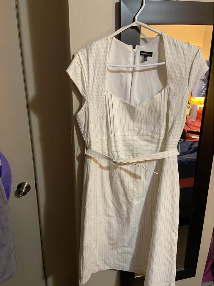 White with black pinstripe knee length dress (if you’re 5’9” like me) worn a total of 3 times. Fitted, with cap sleeve shoulders and pin tuck detail on the back bottom of dress. Has a bit of stretch in the fabric so it’s very comfy. No stains, no rips, and if you know how to wash white to be brighter, it’ll pop. Fits a size 14-16, pickup in South Van or UBC.