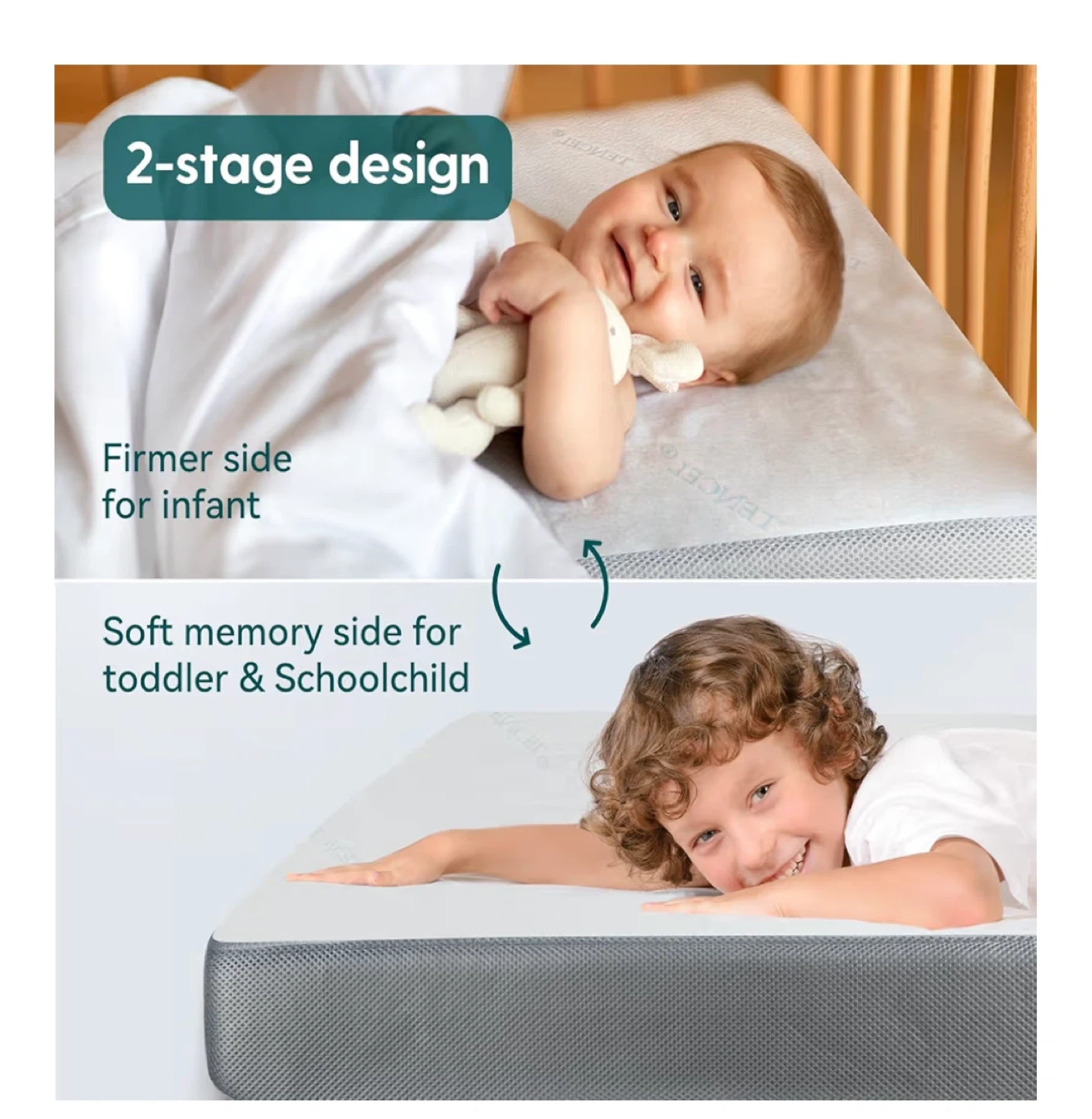 It has a 2-stage design with a firmer side for infants and a soft memory side for toddlers and school-aged children