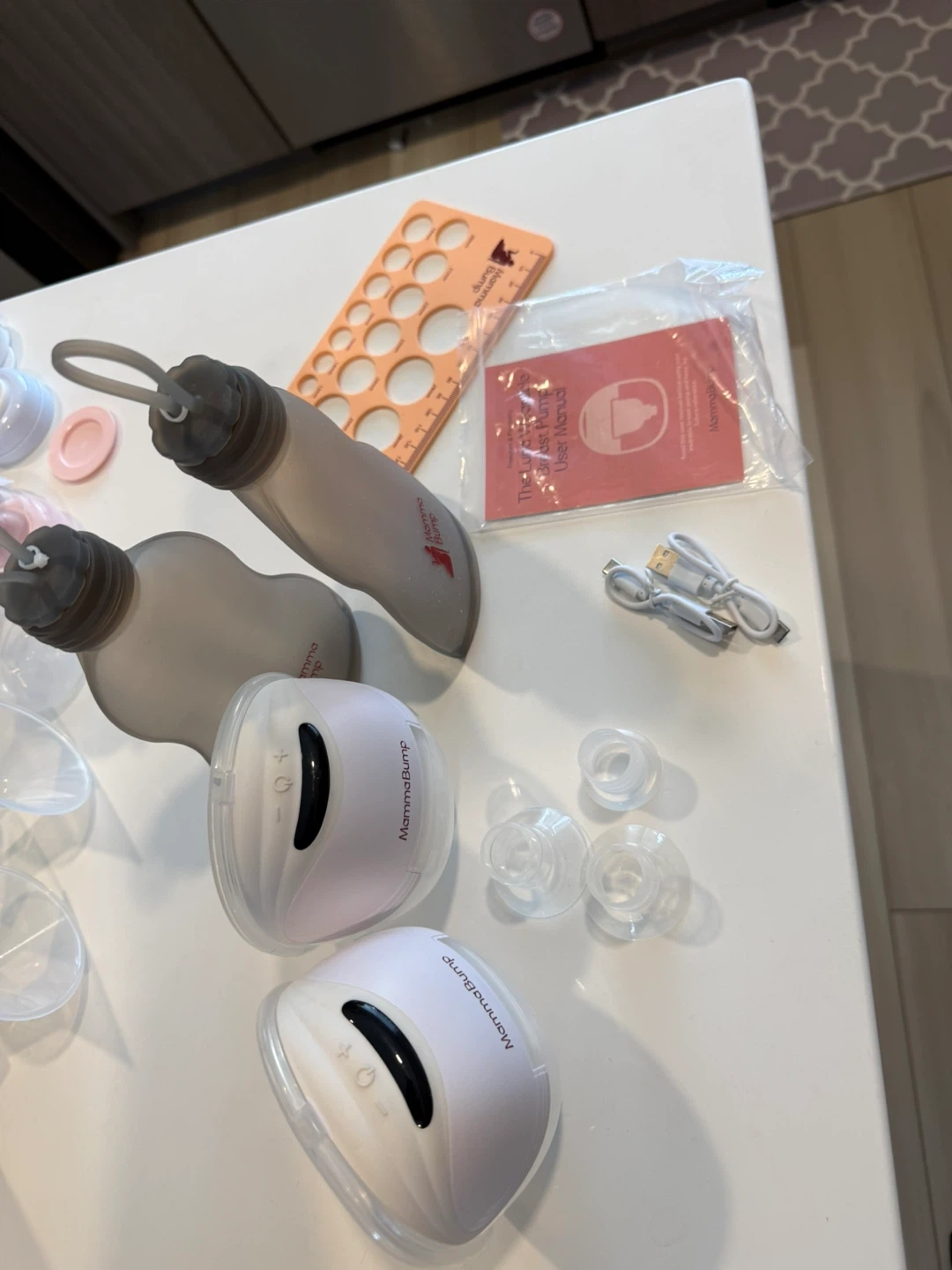 Selling a MammaBump wearable breast pump. It's in great condition and ready for a new home! Comes with 19mm flange size, a charging cord. You’ll also get 2 mammabump milk storage bag and 1 flange size measuring tool and breast pump manual as extra.