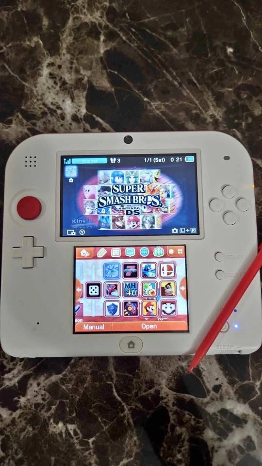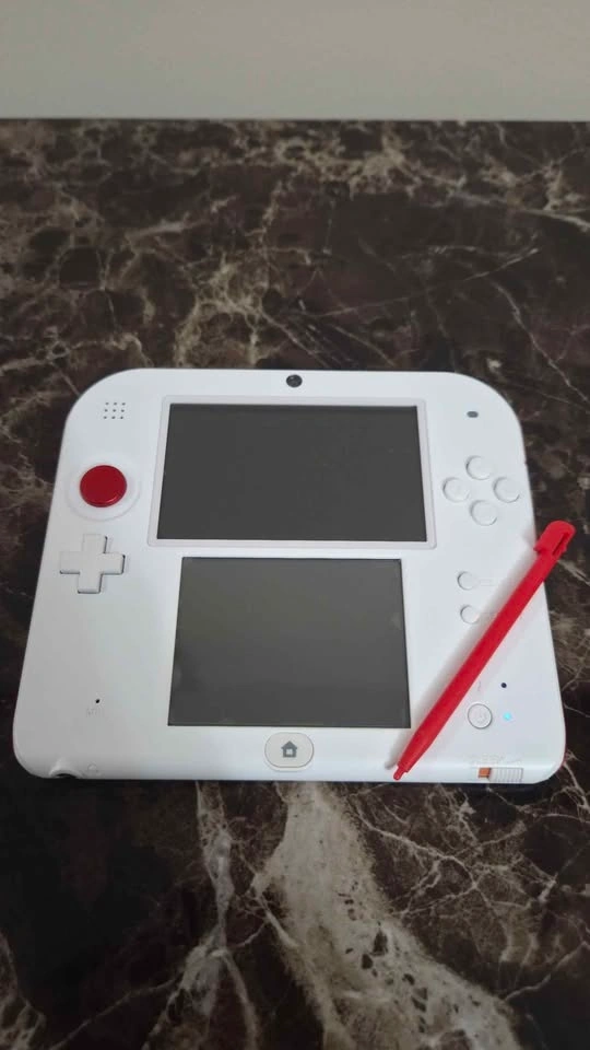 Customized White and Red 2DS Console with top and bottom screen protectors installed. It has 16Gb SD expandable storage, Stylus, Charger, and an upgraded metal circle pad installed. It's modded so you can download and install any 3ds or original ds game free directly on the console. It is clean, and in good condition. The standard rubber circle pad joystick has been replaced with a durable metal one, perfect for Smash Bros fans!
