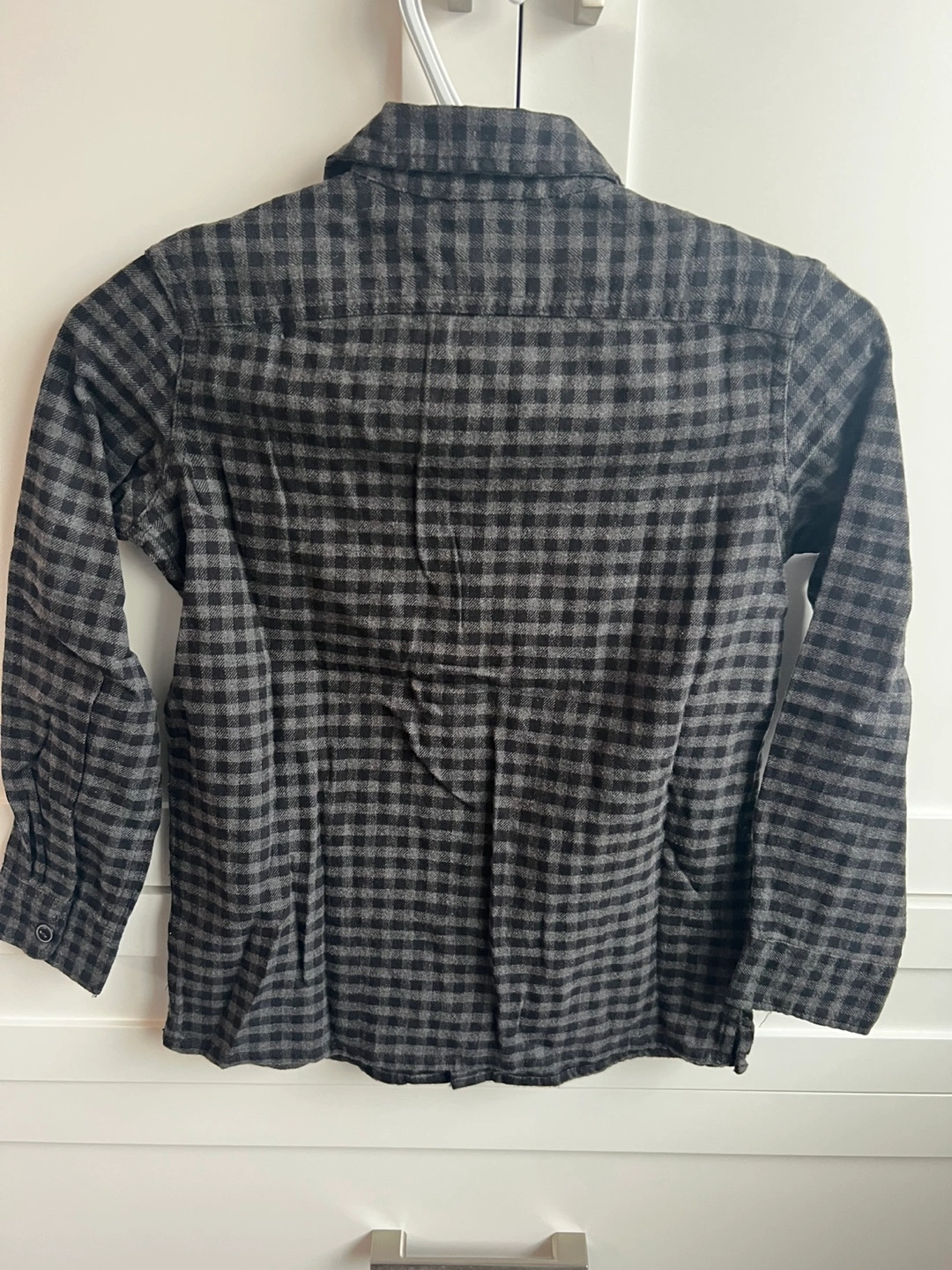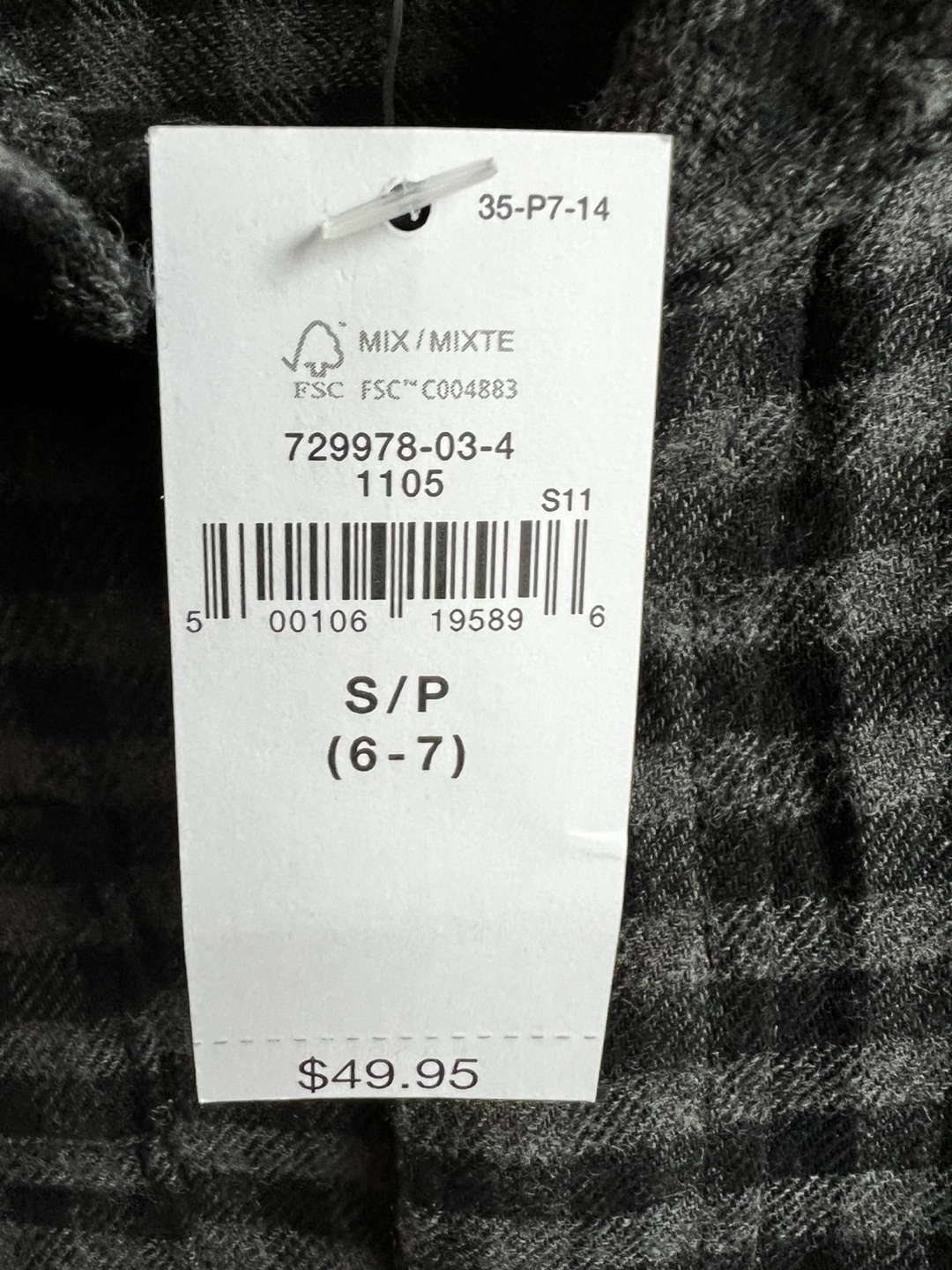 Selling a new Gap Kids plaid flannel shirt in size small (6-7). This cozy shirt features a classic black and grey plaid pattern.