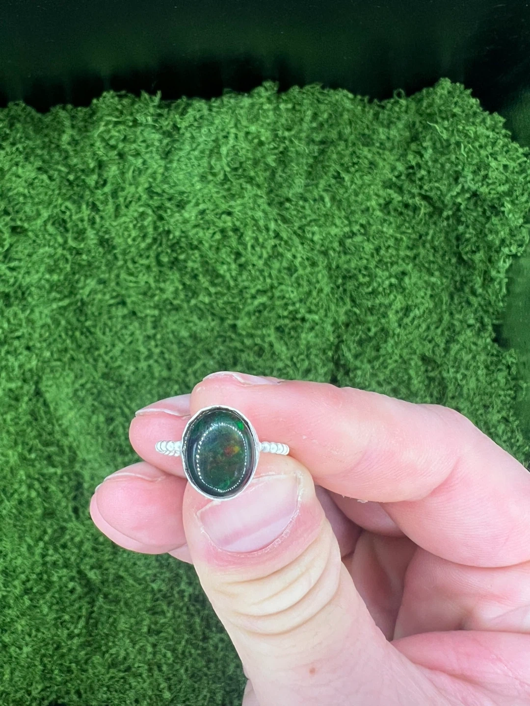 Here's a beautiful oval opal ring! It features a dark opal with flashes of green and red. The band is a textured silver colour. It's in great condition!
