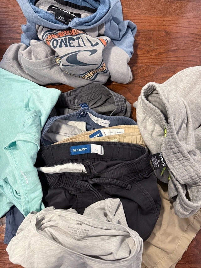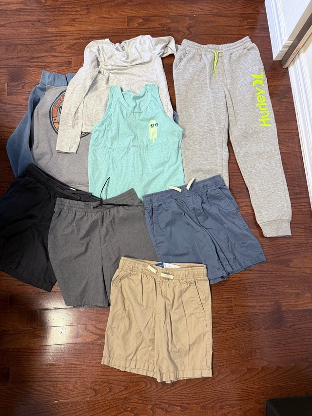 This is a bundle of boys' clothing, size 10, in used condition. There's a variety of items including shorts, shirts, a hoodie, and sweatpants, all perfect for everyday wear. The clothes have been worn, but are still in good, usable condition. A great way to stock up on some clothes for your kiddo! I estimate a fair price for the lot is $40.