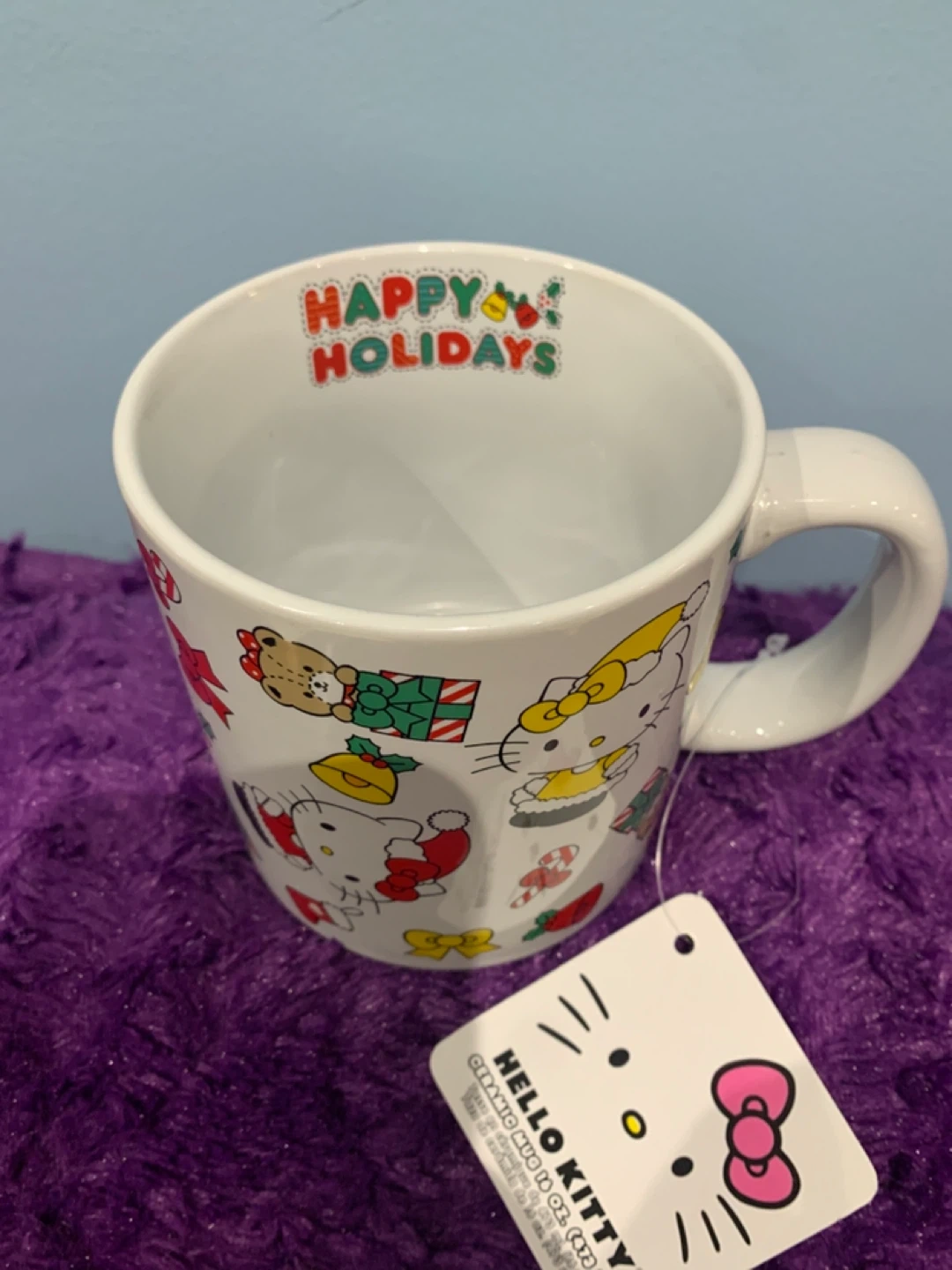 Selling a super cute Hello Kitty ceramic mug! It's brand new with the tag still attached. The mug features a festive "Happy Holidays" design with Hello Kitty and friends. Perfect for adding a touch of kawaii to your morning coffee or tea!