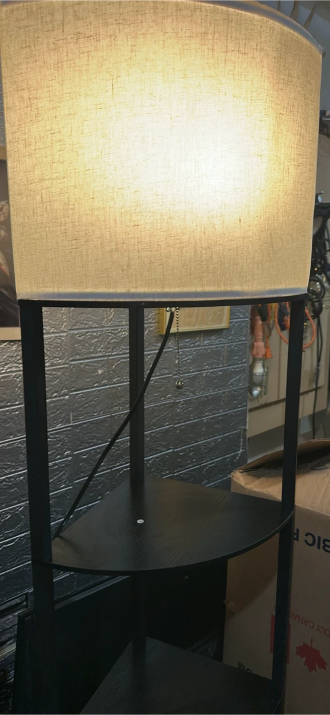 Here's a floor lamp with built-in shelves, perfect for adding a bit of light and storage to any room! The lamp is black and in good condition. It has a simple, modern design that would look great in a living room, bedroom, or office