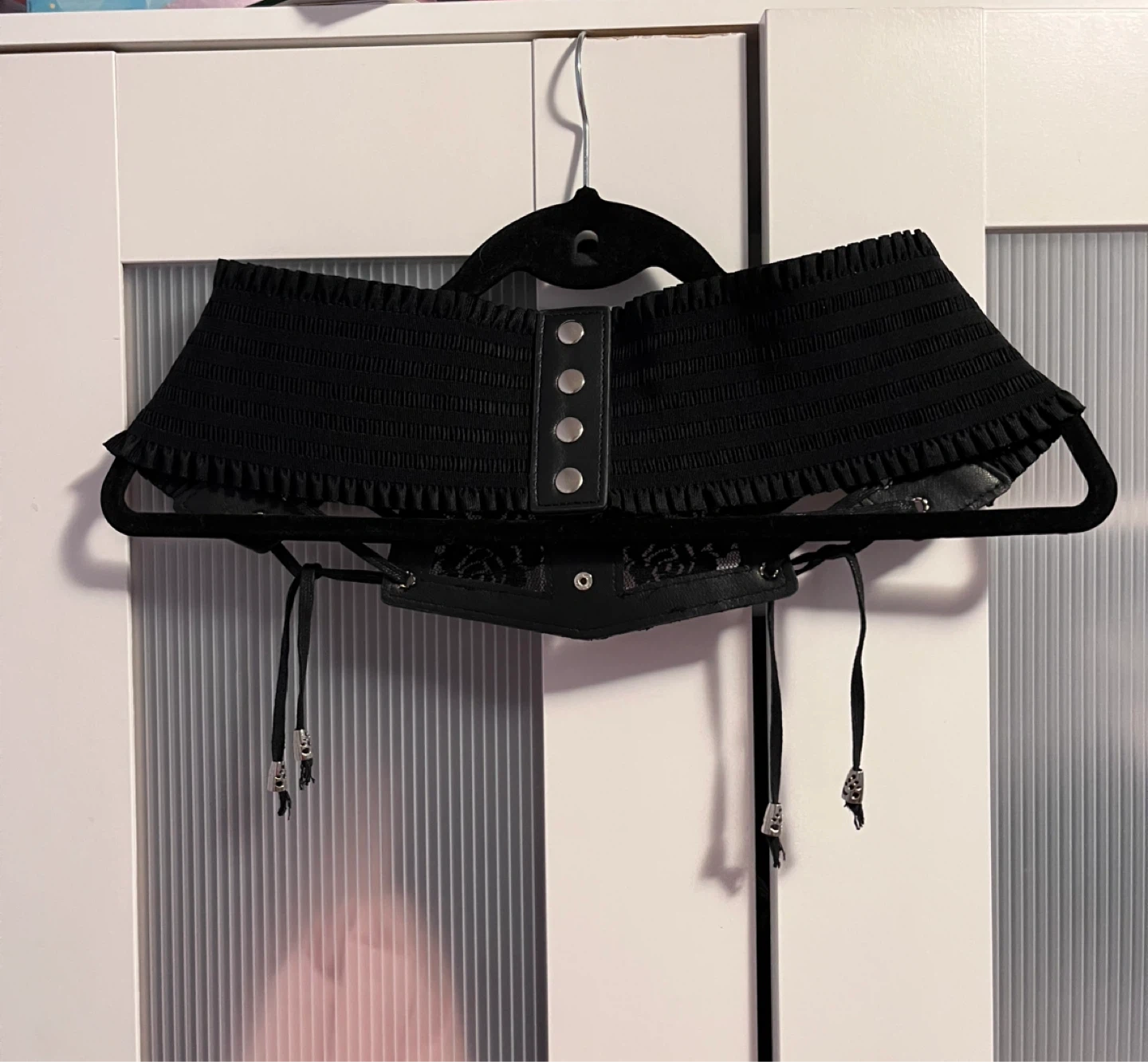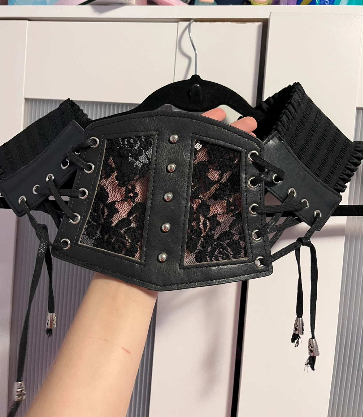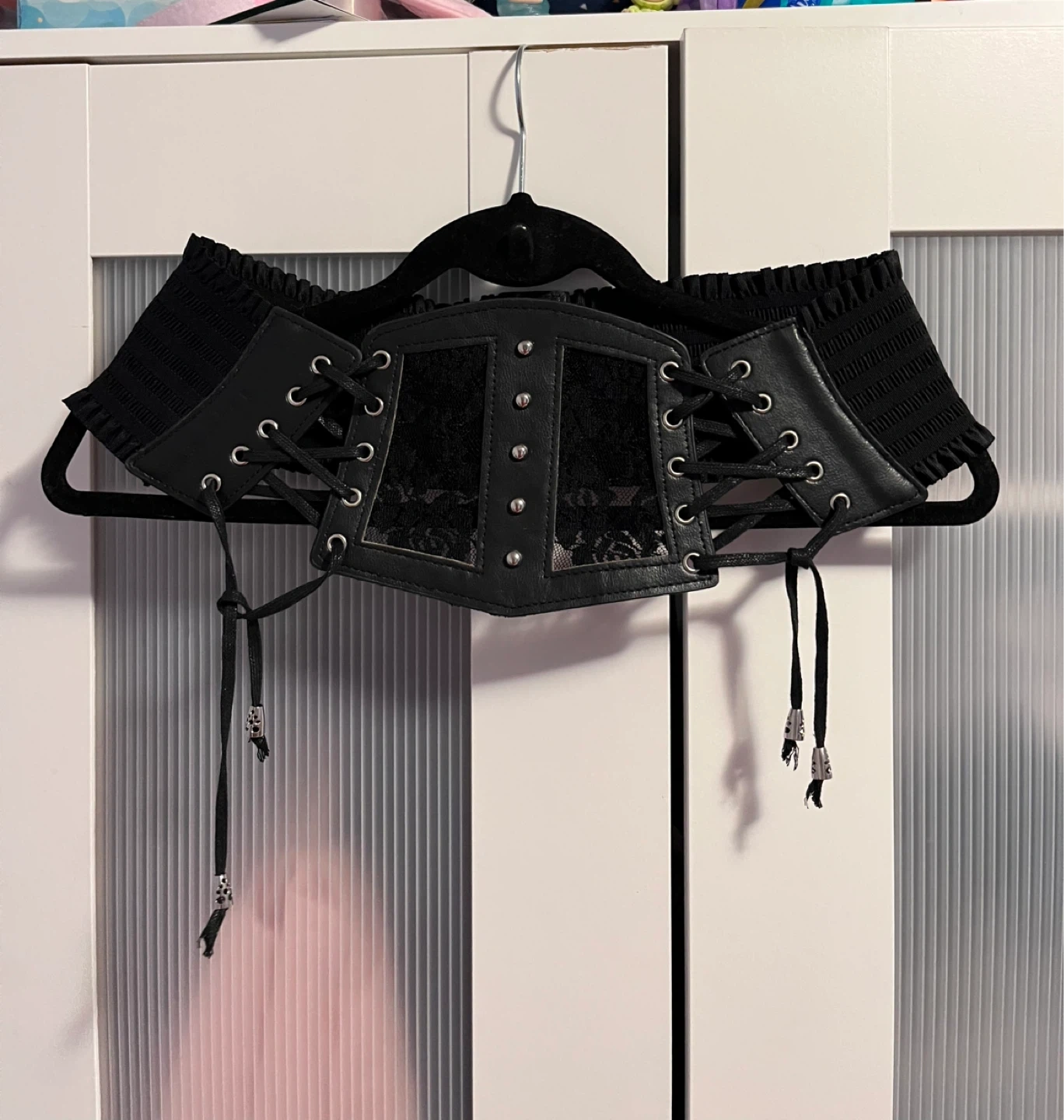 ✨I wore it once to a Stray Kids concert✨Cute black corset belt with lace detailing! It's in great condition and would look great with a variety of outfits. The corset has adjustable ties for a perfect fit!