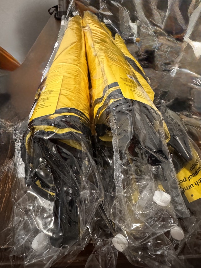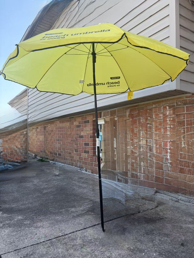 Brand new. 5 available. Size: 5.7 by 6 foot. H: 64 inches Get ready for sunny days with this brand new beach umbrella! It's perfect for keeping cool and shaded at the beach, park, or even your backyard. The bright yellow colour is so stylish! Here are some features: * Lightweight and portable design * Easy to set up * Provides excellent sun protection If the ad is up, it's available!